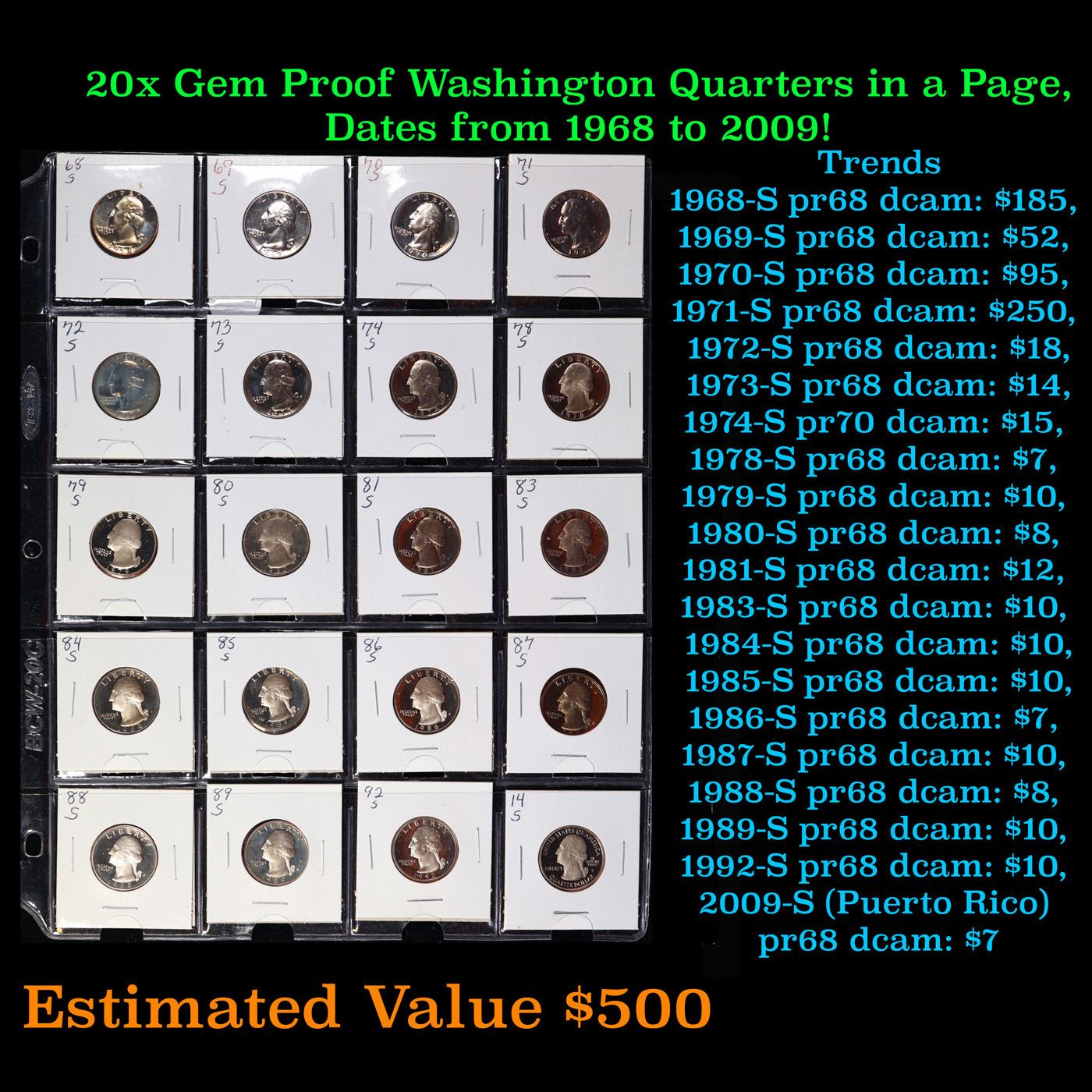 20x Proof Washington Quarters in a Page, Dates from 1968 to 2009! Washington Quarter 25c Grades Brilliant Uncirculated. Up for sale is a page of 20 Proof Jefferson Nickels of the following varieties and trending values: 1968-S pr68 dcam: $185, 1969-S pr68 dcam: $52, 1970-S pr68 dcam: $95, 1971-S pr68 dcam: $250, 1972-S pr68 dcam: $18, 1973-S pr68 dcam: $14, 1974-S pr70 dcam: $15, 1978-S pr68 dcam: $7, 1979-S pr68 dcam: $10, 1980-S pr68 dcam: $8, 1981-S pr68 dcam: $12, 1983-S pr68 dcam: $10, 1984-S pr68 dcam: $10, 1985-S pr68 dcam: $10, 1986-S pr68 dcam: $7, 1987-S pr68 dcam: $10, 1988-S pr68 dcam: $8, 1989-S pr68 dcam: $10, 1992-S pr68 dcam: $10, 2014-S pr68 dcam: $8