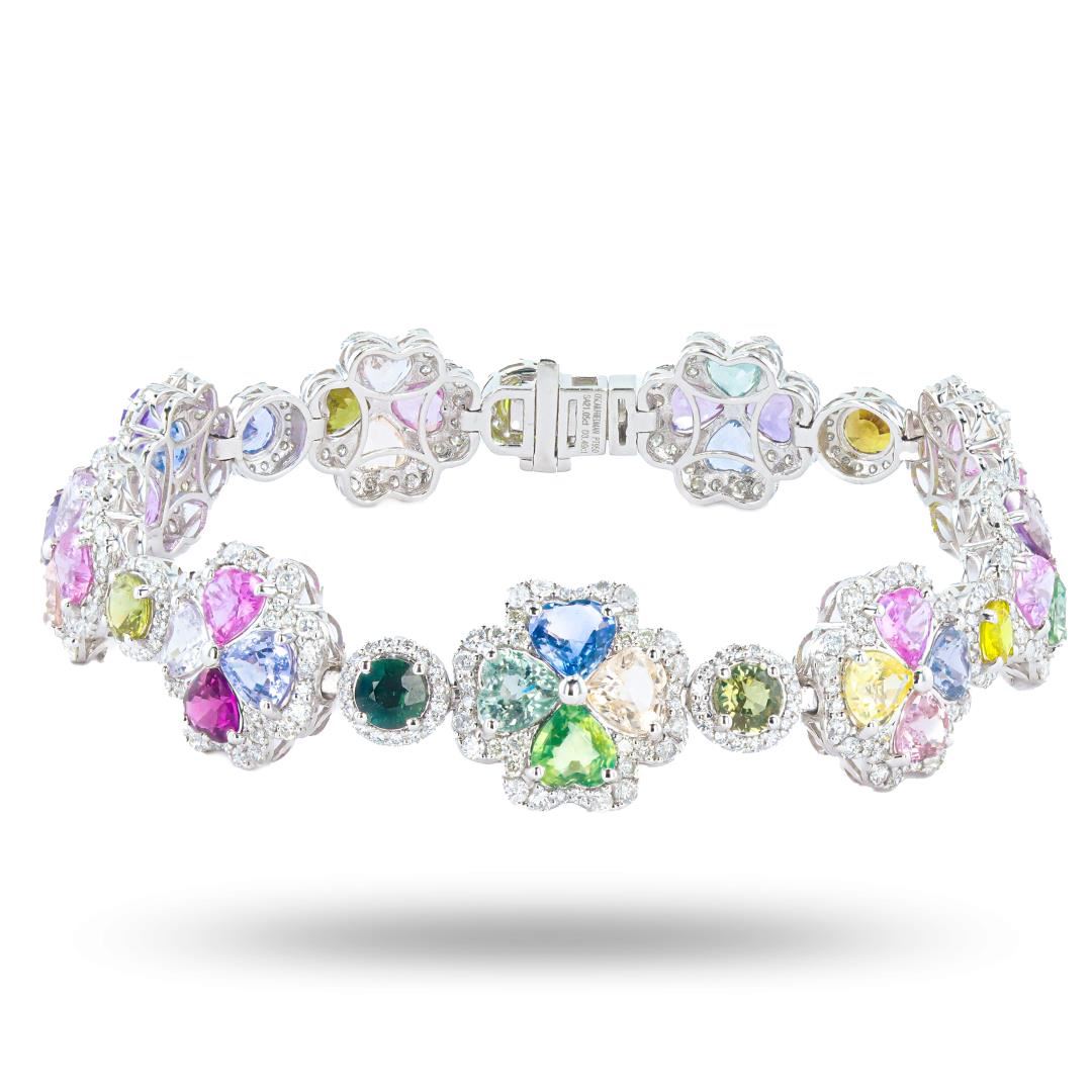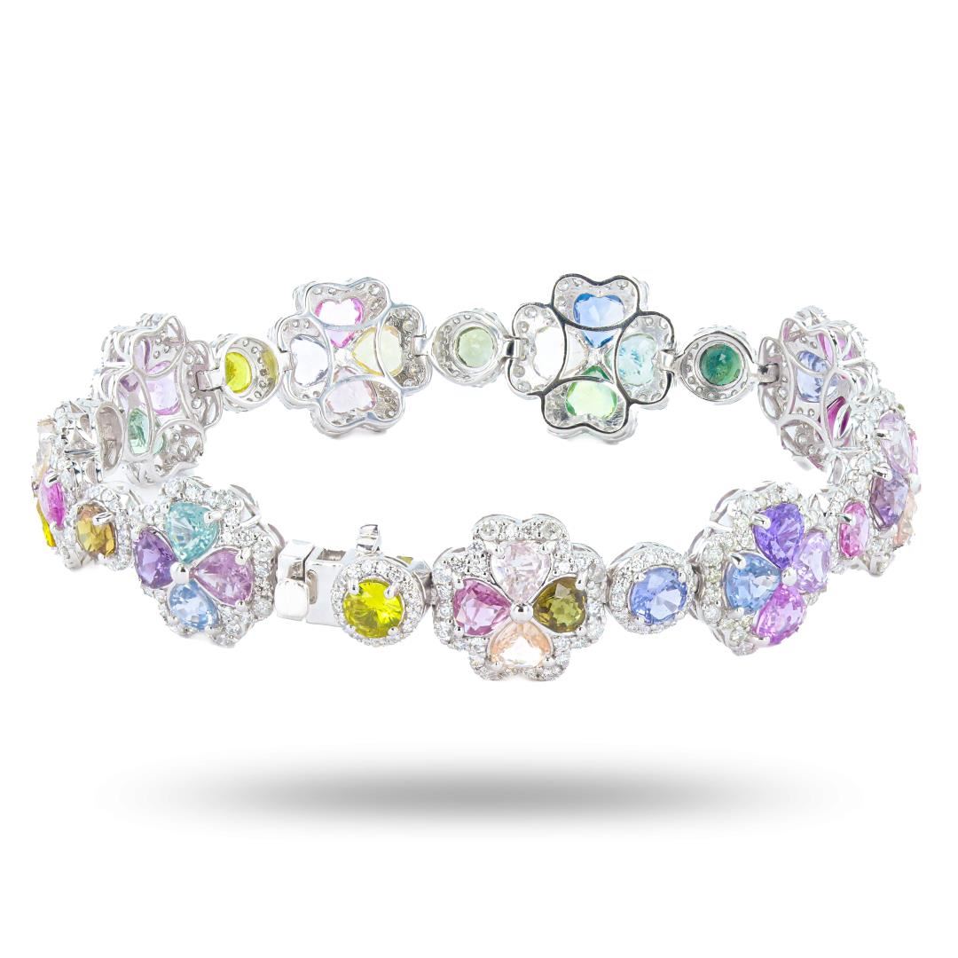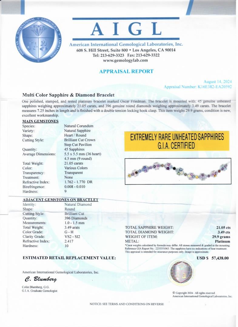 One polished, stamped, and tested platinum bracelet marked Oscar Friedman. The bracelet is mounted with: 45 genuine unheated sapphires weighing approximately 21.05 carats, and 396 genuine round diamonds weighing approximately 3.49 carats. The bracelet measures 7.25 inches in length and is finished with a double tension locking hook clasp. This item weighs 29.9 grams, condition is new, excellent workmanship. #MAIN GEMSTONES# Species: Natural Corundum Variety: Natural Sapphire Shape: Heart / Round Cutting Style: Brilliant Cut Crown, Step Cut Pavilion Quantity: 45 Sapphires Average Dimensions: 5.5 x 5.5mm (36 heart), 4.5mm (9 round) Total Weight: 21.05 carats Color: Various Colors Transparency: Transparent Treatment: None Refractive Index: 1.762 - 1.770 DR Birefringence: 0.008 - 0.010 Hardness: 9 #ADJACENT GEMSTONES ON BRACELET# Identity: Natural Diamond Shape: Round Cutting Style: Brilliant Cut Quantity: 396 Diamonds Measurements: 1.0 - 1.5mm Total Weight: 3.49 carats Color Grade: G-H Clarity Grade: VS2-SI2 Refractive Index: 2.417 Hardness: 10 TOTAL SAPPHIRE WEIGHT: 21.05 cts TOTAL DIAMOND WEIGHT: 3.49 cts WEIGHT OF ITEM: 29.9 grams METAL: Platinum Size: 7 1/4