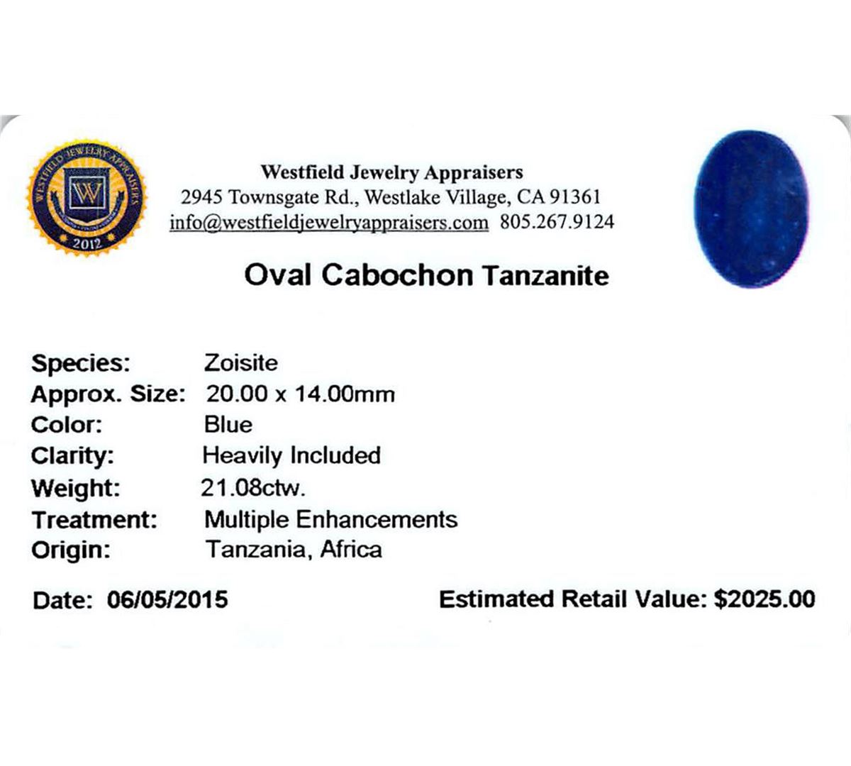 One oval cabochon cut natural tanzanite, measuring 20.00 x 14.00 x 8.00mm, exact weight 21.08ct., clarity is heavily included, type I, dark, very slightly grayish, blue color, (GIA B 7/3), cut is good. Transmitting light somewhat diffusely, transparent to translucent. Naturally occurring internal & external characteristics are present. Indications of heat treatment. Westfield Appraised at $2,025.00.