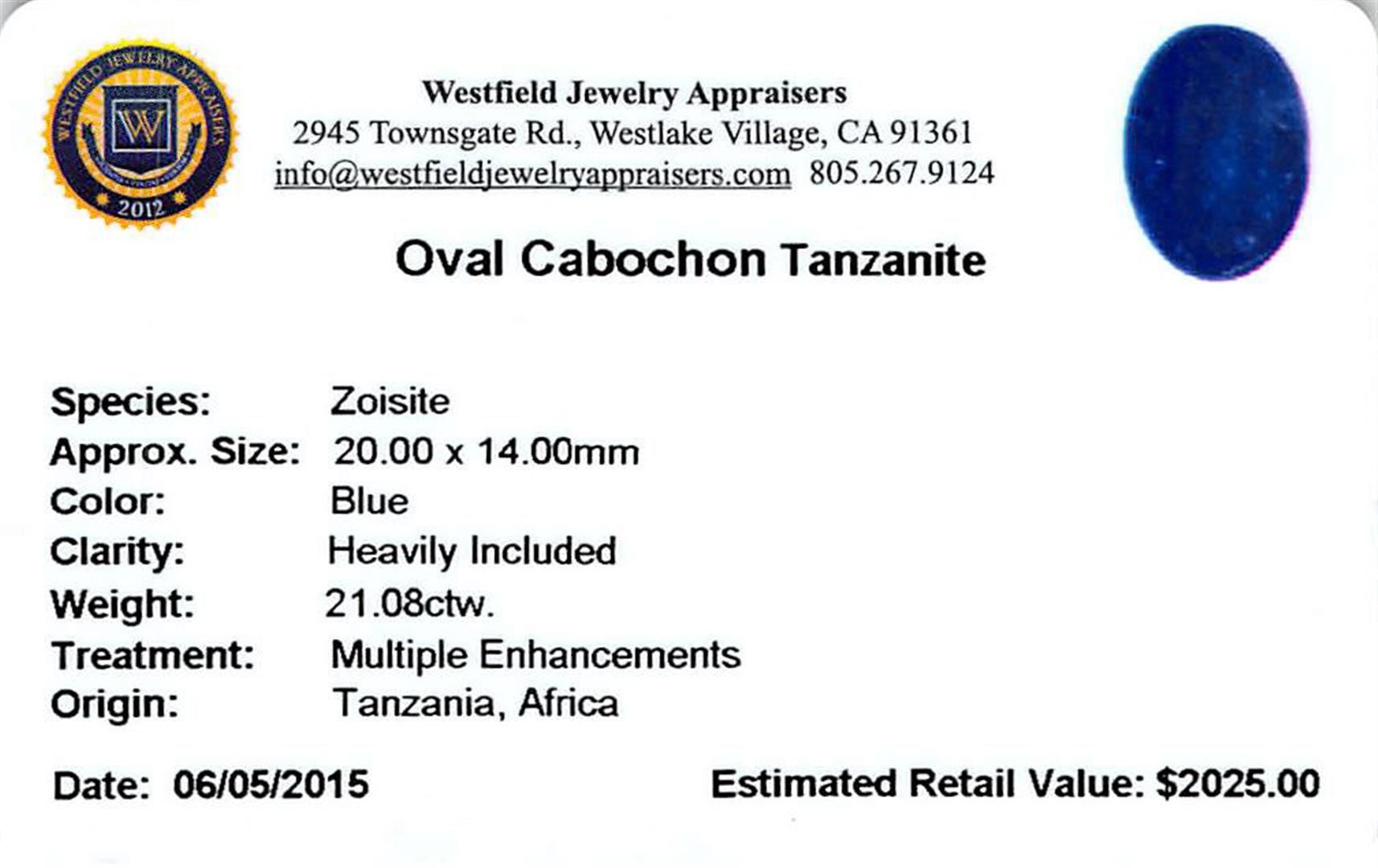 One oval cabochon cut natural tanzanite, measuring 20.00 x 14.00 x 8.00mm, exact weight 21.08ct., clarity is heavily included, type I, dark, very slightly grayish, blue color, (GIA B 7/3), cut is good. Transmitting light somewhat diffusely, transparent to translucent. Naturally occurring internal & external characteristics are present. Indications of heat treatment. Westfield Appraised at $2,025.00.