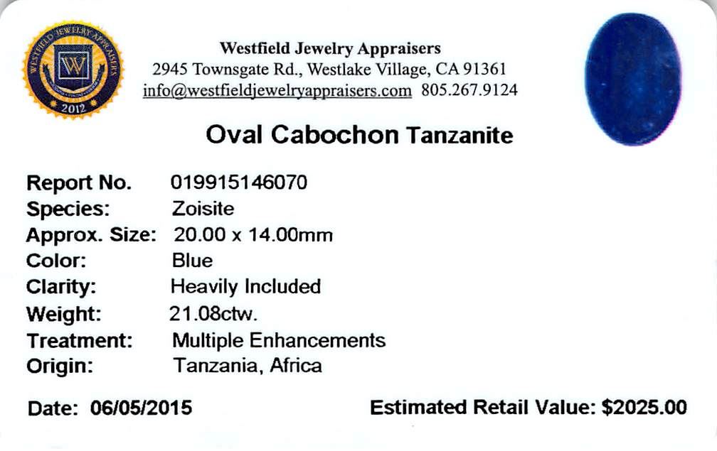 One oval cabochon cut natural tanzanite, measuring 20.00 x 14.00 x 8.00mm, exact weight 21.08ct., clarity is heavily included, type I, dark, very slightly grayish, blue color, (GIA B 7/3), cut is good. Transmitting light somewhat diffusely, transparent to translucent. Naturally occurring internal & external characteristics are present. Indications of heat treatment. Westfield Appraised at $2,025.00.