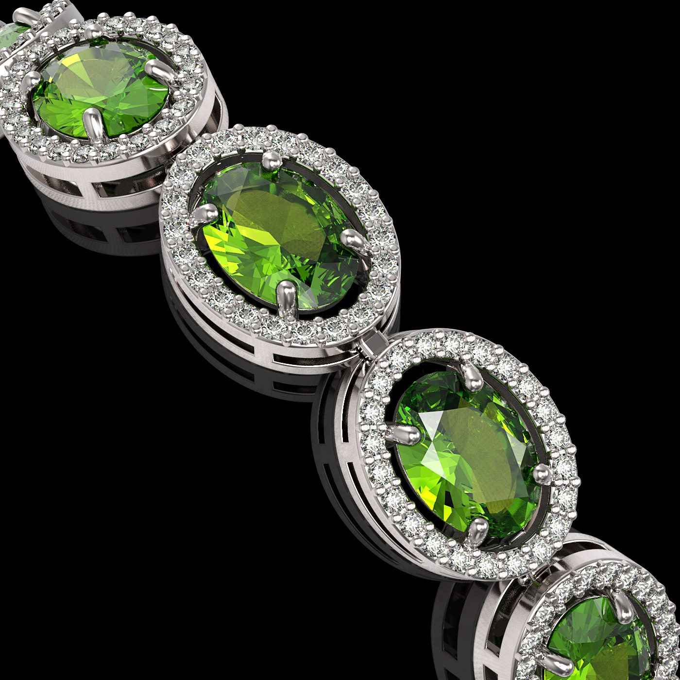 REF-286Y5K -40628 ---- 21.13 CTW Peridot & Diamond Halo Bracelet 10K White Gold ---- Luxury Designer Brand Bracelet Appraised at $15,750 Certificate Number US40628 10k White gold, Bracelet Size is 7 Inches, Bracelet measuring approx. 9 mm x 7 Inches, weighing in total approx. 14 grams. Made in the USA and is stamped 10k, Main stone 18.0482926829268 carat total weight containing 17 pieces of Intense Green color with AAA quality Oval shape cut Peridot , Stone #2 3.08 carat total weight containing 374 pieces of G-H color with VS/SI quality Round shape cut Diamond