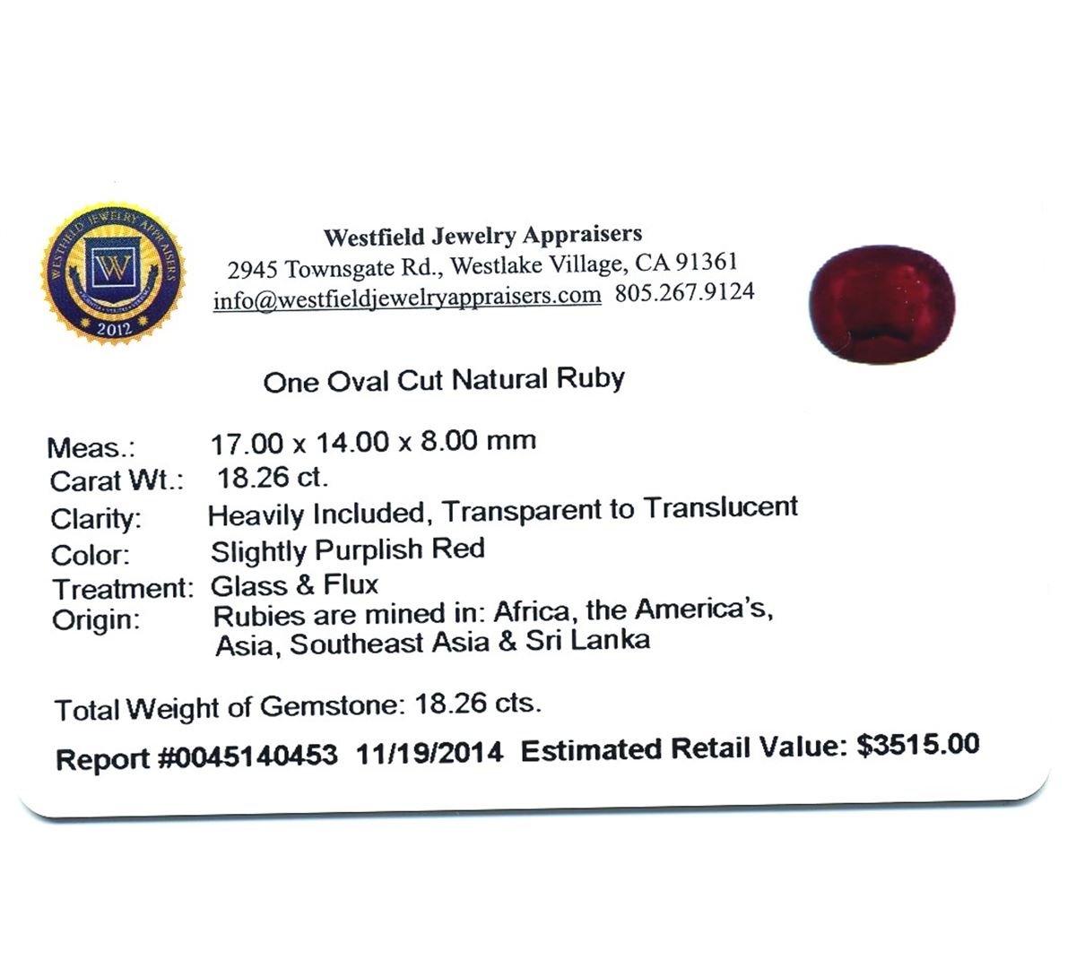 21.15ct. One Oval Cut Natural Ruby Westfield Appraised at $4,070.00.