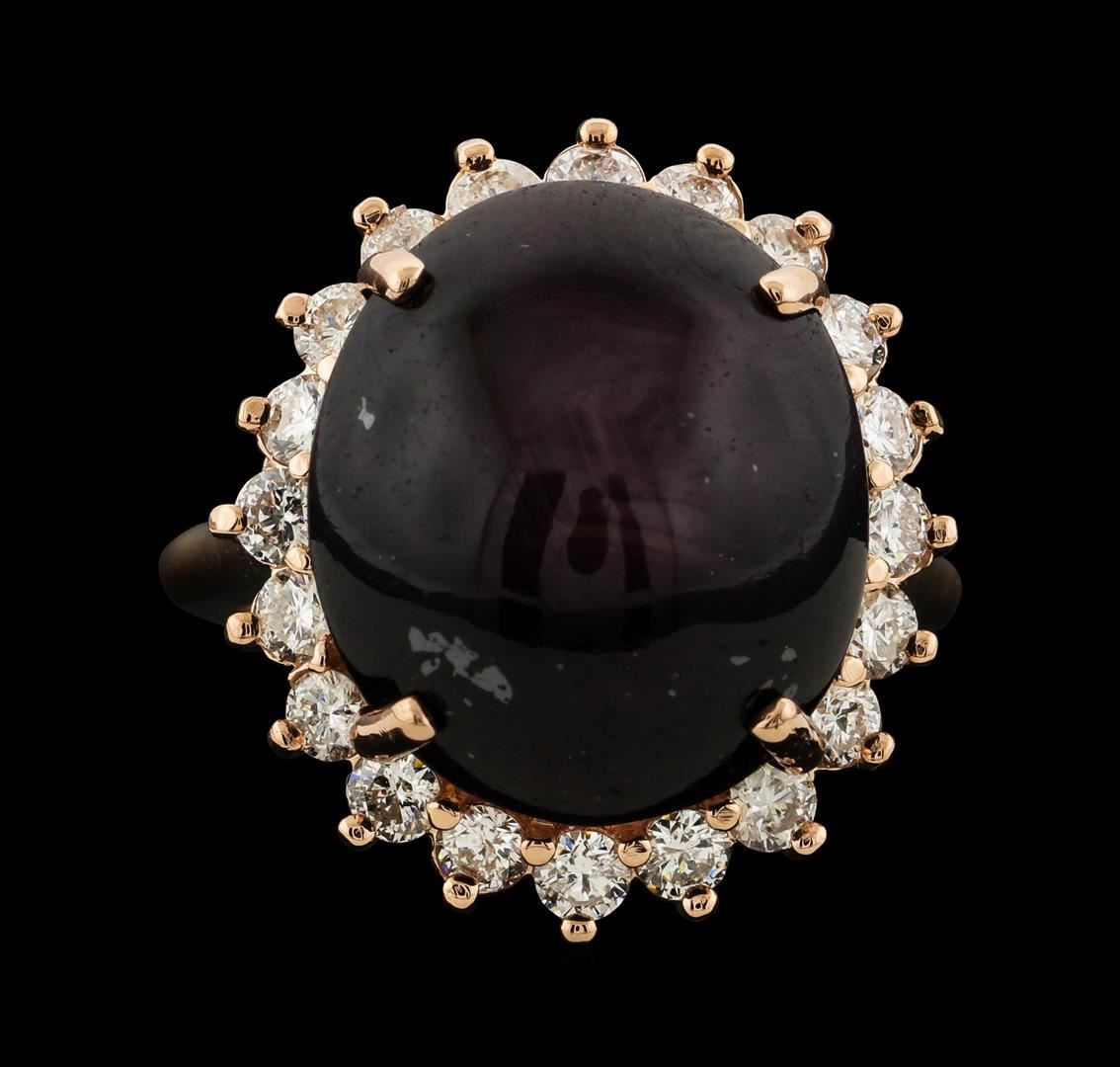 One electronically tested 14KT rose gold lady's cast fashion ring with a cathedral shank with a basket halo with a bright polish finish. The featured lady's ring has a shank measuring 2.00 millimeters wide. Identified with markings of '14K'. Condition is new, good workmanship. Containing: One prong set oval cabochon cut natural star ruby, measuring 16.35 x 14.20 x 9.00mm, (depth est.) approximate weight of 21.16ct., clarity is heavily included, medium dark, slightly brownish, strongly purplish red color, (GIA stpR 6/2), cut is good. This stone has a mostly complete six ray star with weak intensity and good movement. Transmitting light somewhat diffusely, semi-transparent to translucent. Colored gemstones are presumed to have been subjected to commonly used enhancement processes. Graded in the setting. Twenty prong set round brilliant cut diamonds, measuring 2.50 - 2.40 x 1.49mm (depth est.) approximate total weight of 20 Stones = 1.10ct. Graded in the setting. Clarity SI-1 to SI-2. Color: H - I Cut Very Good. Total Weight of Colored Stones 21.16ct.. Total Weight of Diamonds 1.10ct.. Total Weight of Ring 10.90gm. GAS Appraised at $6,400.00.