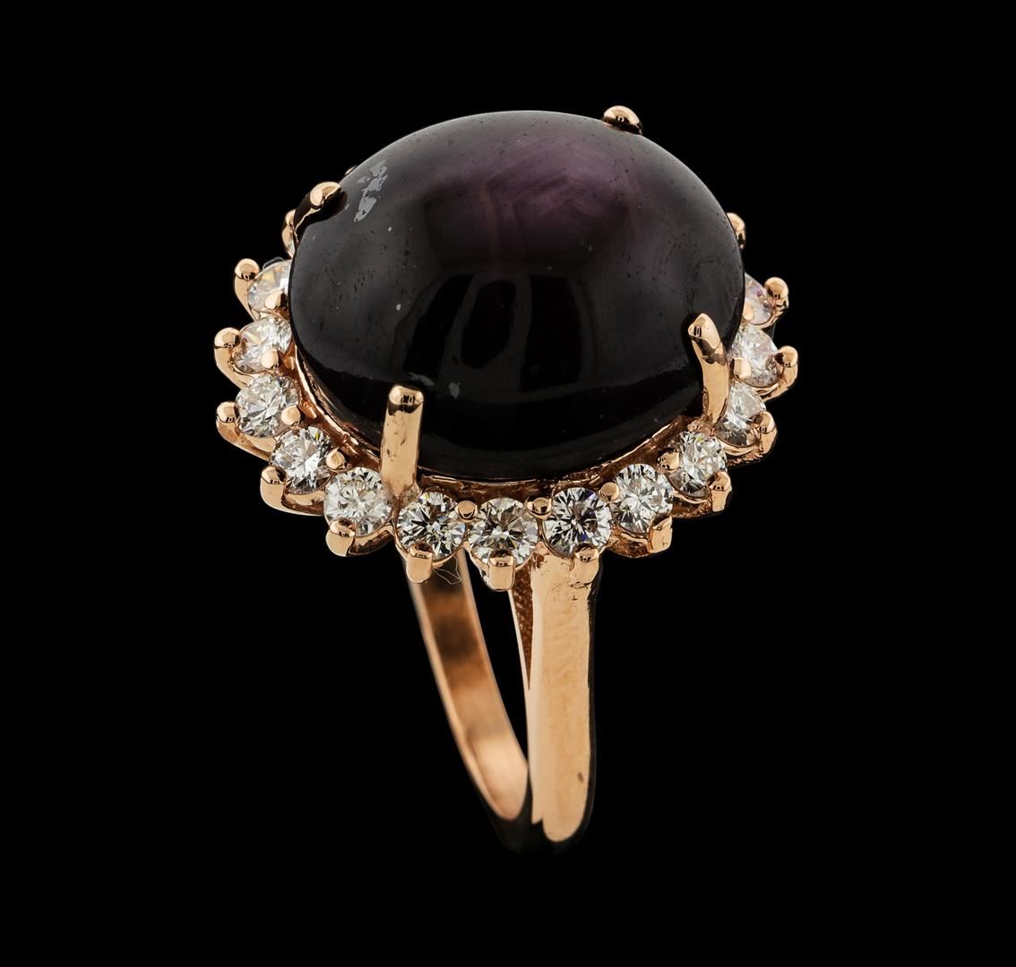 One electronically tested 14KT rose gold lady's cast fashion ring with a cathedral shank with a basket halo with a bright polish finish. The featured lady's ring has a shank measuring 2.00 millimeters wide. Identified with markings of '14K'. Condition is new, good workmanship. Containing: One prong set oval cabochon cut natural star ruby, measuring 16.35 x 14.20 x 9.00mm, (depth est.) approximate weight of 21.16ct., clarity is heavily included, medium dark, slightly brownish, strongly purplish red color, (GIA stpR 6/2), cut is good. This stone has a mostly complete six ray star with weak intensity and good movement. Transmitting light somewhat diffusely, semi-transparent to translucent. Colored gemstones are presumed to have been subjected to commonly used enhancement processes. Graded in the setting. Twenty prong set round brilliant cut diamonds, measuring 2.50 - 2.40 x 1.49mm (depth est.) approximate total weight of 20 Stones = 1.10ct. Graded in the setting. Clarity SI-1 to SI-2. Color: H - I Cut Very Good. Total Weight of Colored Stones 21.16ct.. Total Weight of Diamonds 1.10ct.. Total Weight of Ring 10.90gm. GAS Appraised at $6,400.00.