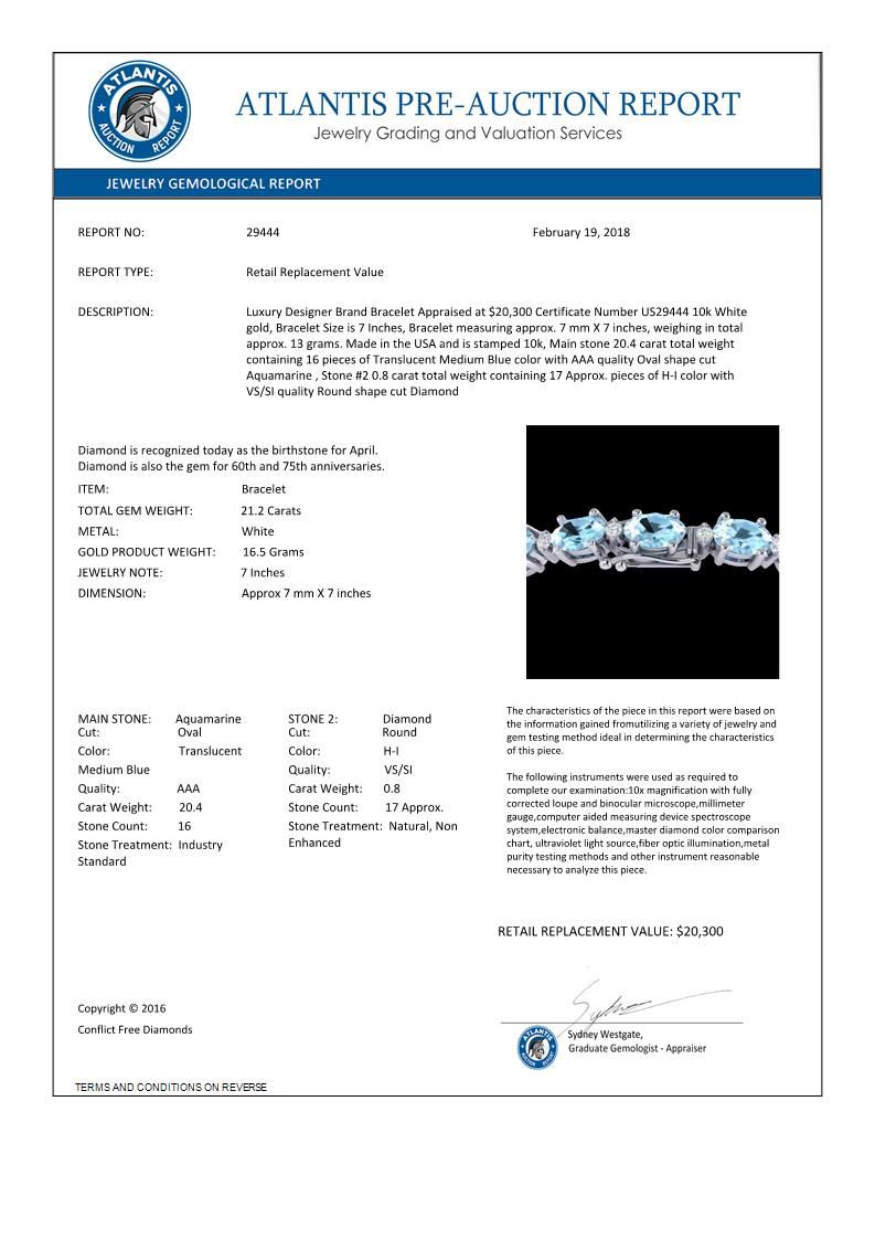 REF-263W6F -29444 ---- 21.2 CTW Aquamarine & VS/SI Certified Diamond Eternity Bracelet 10K White Gold ---- Luxury Designer Brand Bracelet Appraised at $20,300 Certificate Number US29444 10k White gold, Bracelet Size is 7 Inches, Bracelet measuring approx. 7 mm X 7 inches, weighing in total approx. 13 grams. Made in the USA and is stamped 10k, Main stone 20.4 carat total weight containing 16 pieces of Translucent Medium Blue color with AAA quality Oval shape cut Aquamarine , Stone #2 0.8 carat total weight containing 17 Approx. pieces of H-I color with VS/SI quality Round shape cut Diamond