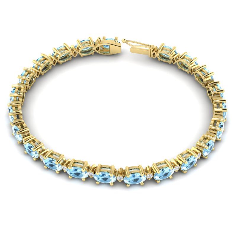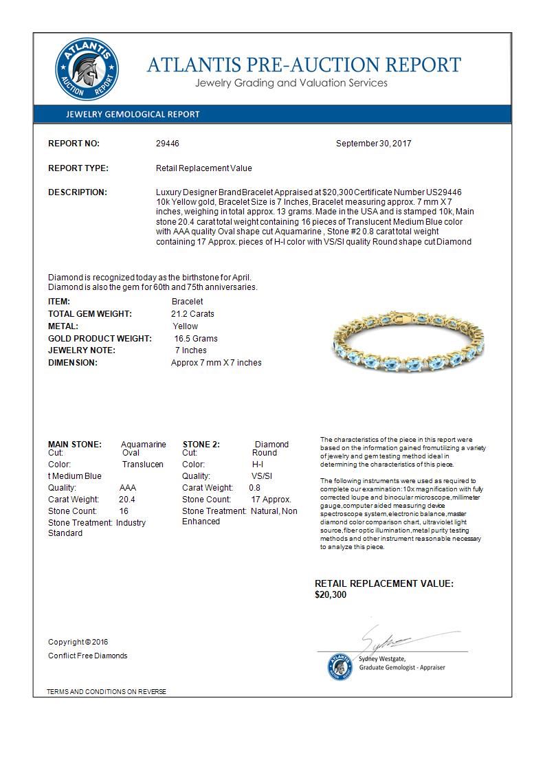 29446 - REF-263N6A ---- 21.2 CTW Aquamarine & VS/SI Certified Diamond Eternity Bracelet 10K Yellow Gold ---- Luxury Designer Brand Bracelet Appraised at $20,300 Certificate Number US29446 10k Yellow gold, Bracelet Size is 7 Inches, Bracelet measuring approx. 7 mm X 7 inches, weighing in total approx. 13 grams. Made in the USA and is stamped 10k, Main stone 20.4 carat total weight containing 16 pieces of Translucent Medium Blue color with AAA quality Oval shape cut Aquamarine , Stone #2 0.8 carat total weight containing 17 Approx. pieces of H-I color with VS/SI quality Round shape cut Diamond