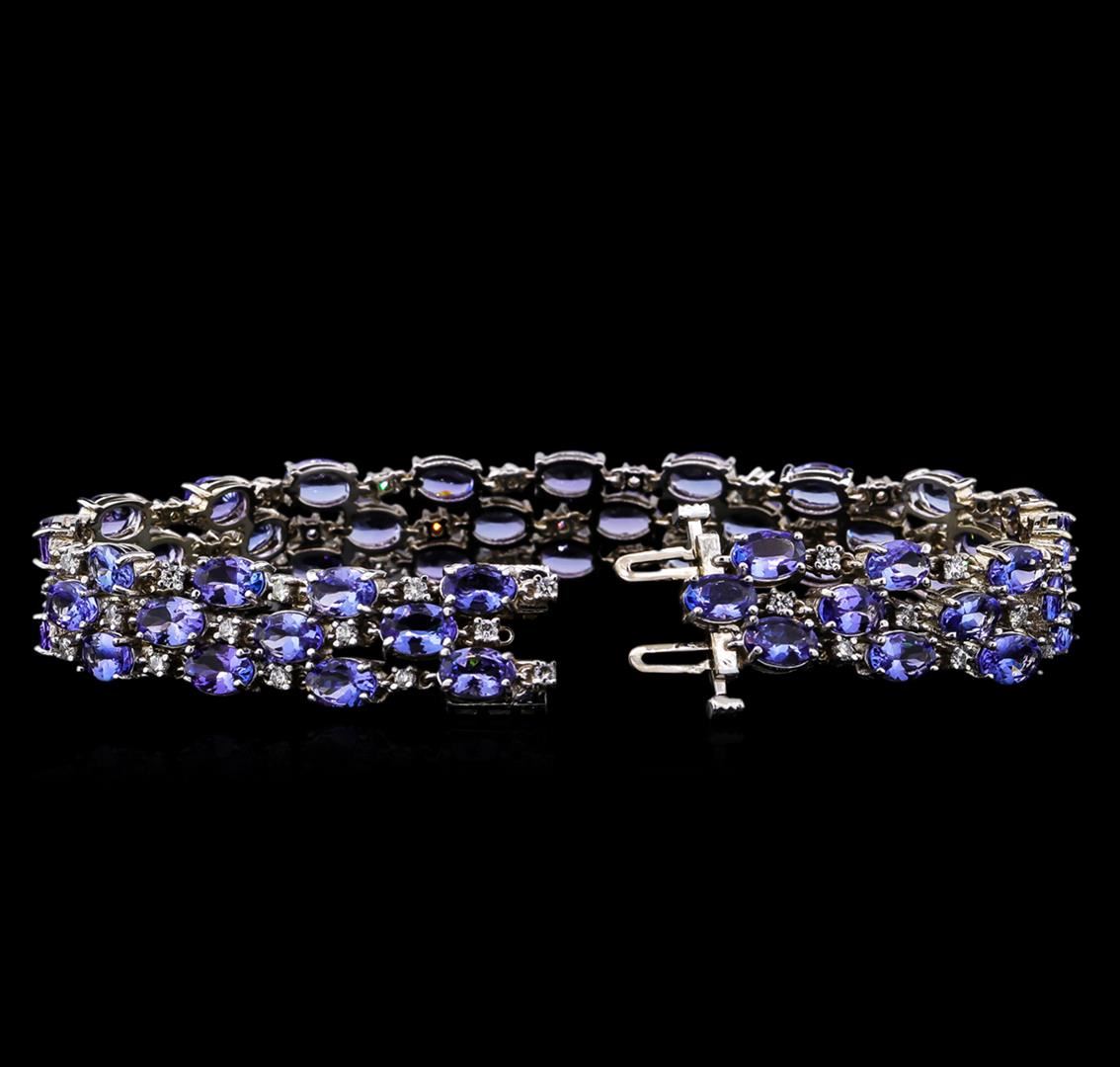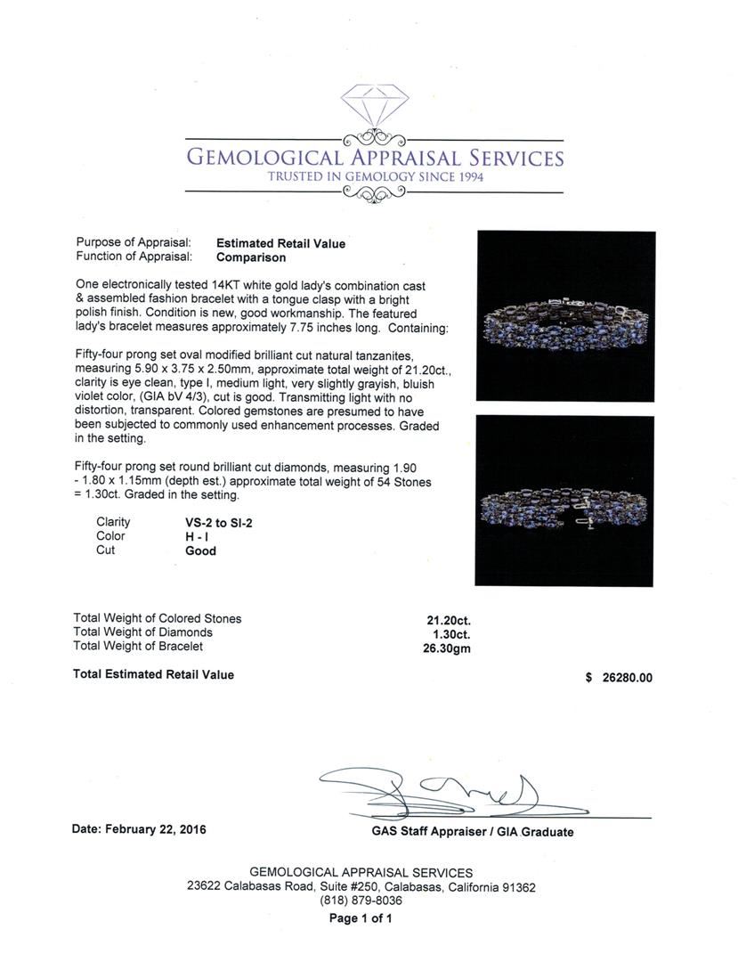 One electronically tested 14KT white gold lady's combination cast & assembled fashion bracelet with a tongue clasp with a bright polish finish. The featured lady's bracelet measures approximately 7.75 inches long. Condition is new, good workmanship. Containing: Fifty-four prong set oval modified brilliant cut natural tanzanites, measuring 5.90 x 3.75 x 2.50mm, approximate total weight of 21.20ct., clarity is eye clean, type I, medium light, very slightly grayish, bluish violet color, (GIA bV 4/3), cut is good. Transmitting light with no distortion, transparent. Colored gemstones are presumed to have been subjected to commonly used enhancement processes. Graded in the setting. Fifty-Four prong set round brilliant cut diamonds, measuring 1.90 - 1.80 x 1.15mm (depth est.) approximate total weight of 54 Stones = 1.30ct. Graded in the setting. Clarity: VS-2 to SI-2. Color: H - I. Cut Good. Total Weight of Colored Stones 21.20ct. Total Weight of Diamonds 1.30ct. Total Weight of Bracelet 26.30gm. GAS Appraised at $26,280.00.