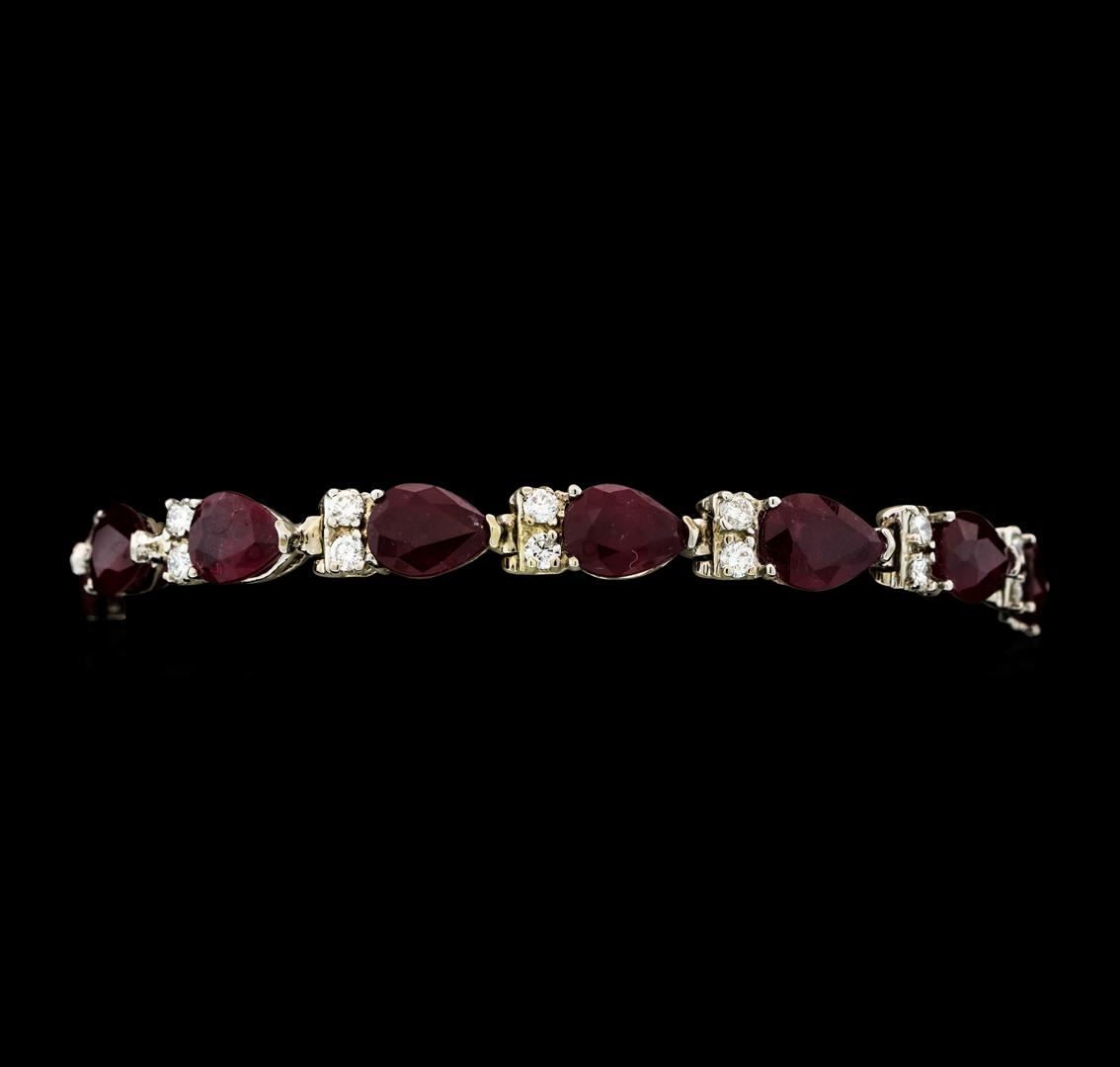 One electronically tested 14KT white gold lady's combination cast & assembled fashion bracelet with a tongue clasp with foldover safety with a bright polish finish. The featured lady's bracelet measures approximately seven inches in length. Identified with markings of '14K'. Condition is new, good workmanship. Containing: Fifteen prong set pear modified mixed cut natural rubies, measuring 7.90 x 5.90 x 3.84mm, (depth est.) approximate total weight of 21.24ct., clarity is heavily included, medium dark, strong, slightly purplish red color, (GIA slpR 6/5), cut is very good. Transmitting light somewhat diffusely, semi-transparent to translucent. Naturally occurring internal & external characteristics are present. Indications of laboratory high temperature heat treatment, with glass & flux additives. Colored gemstones are presumed to have been subjected to commonly used enhancement processes. Graded in the setting. Thirty prong set round brilliant cut diamonds, measuring 2.30 - 2.25 x 1.41mm (depth est.) approximate total weight of 30 Stones = 1.37ct. Graded in the setting. Clarity SI-1 to I-1. Color: H - I Cut Good. Total Weight of Colored Stones 21.24ct.. Total Weight of Diamonds 1.37ct.. Total Weight of Bracelet 14.10gm GAS Appraised at $8,715.00.