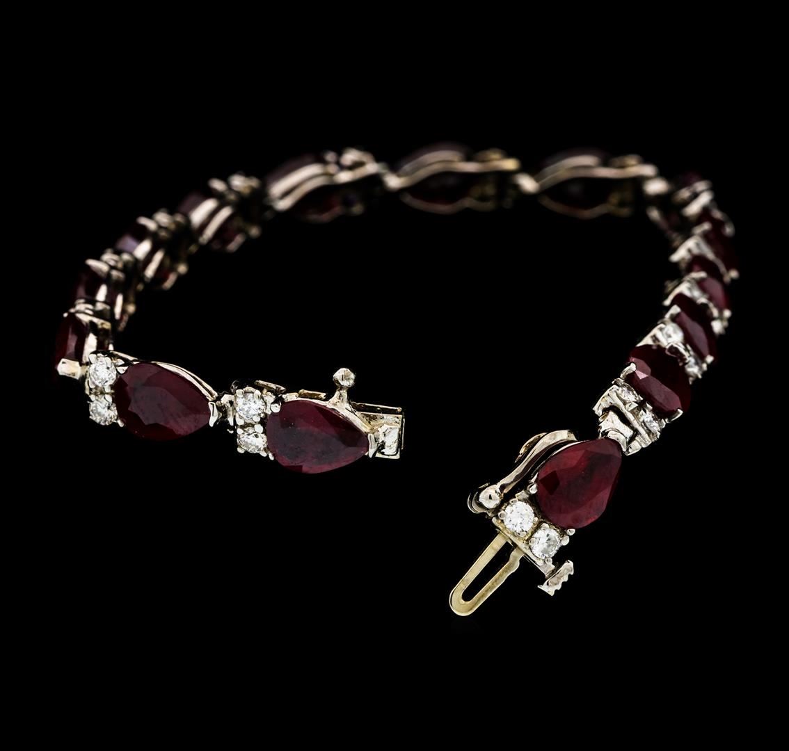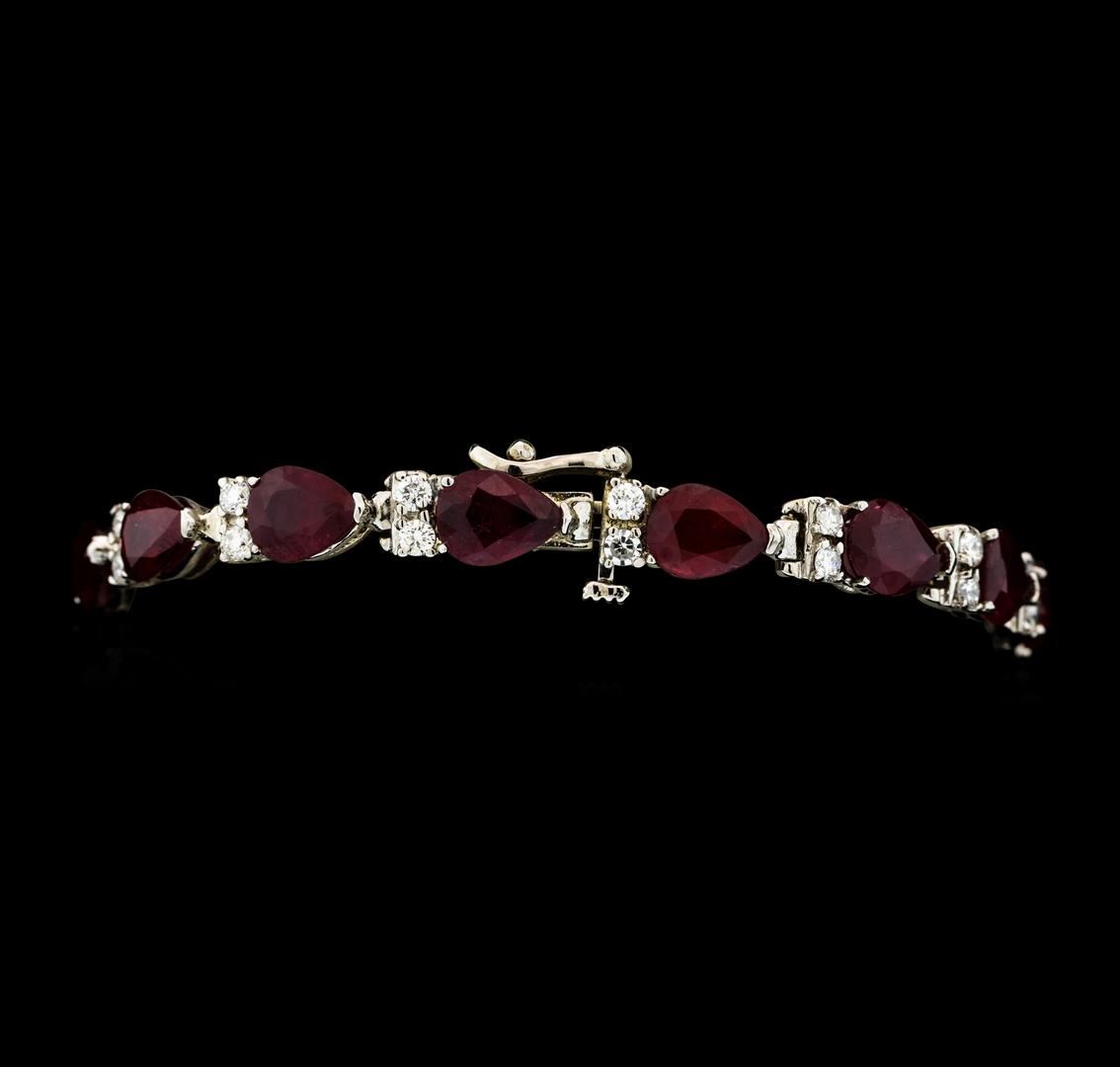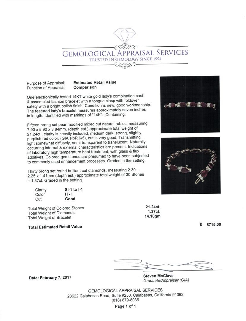 One electronically tested 14KT white gold lady's combination cast & assembled fashion bracelet with a tongue clasp with foldover safety with a bright polish finish. The featured lady's bracelet measures approximately seven inches in length. Identified with markings of '14K'. Condition is new, good workmanship. Containing: Fifteen prong set pear modified mixed cut natural rubies, measuring 7.90 x 5.90 x 3.84mm, (depth est.) approximate total weight of 21.24ct., clarity is heavily included, medium dark, strong, slightly purplish red color, (GIA slpR 6/5), cut is very good. Transmitting light somewhat diffusely, semi-transparent to translucent. Naturally occurring internal & external characteristics are present. Indications of laboratory high temperature heat treatment, with glass & flux additives. Colored gemstones are presumed to have been subjected to commonly used enhancement processes. Graded in the setting. Thirty prong set round brilliant cut diamonds, measuring 2.30 - 2.25 x 1.41mm (depth est.) approximate total weight of 30 Stones = 1.37ct. Graded in the setting. Clarity SI-1 to I-1. Color: H - I Cut Good. Total Weight of Colored Stones 21.24ct.. Total Weight of Diamonds 1.37ct.. Total Weight of Bracelet 14.10gm GAS Appraised at $8,715.00.
