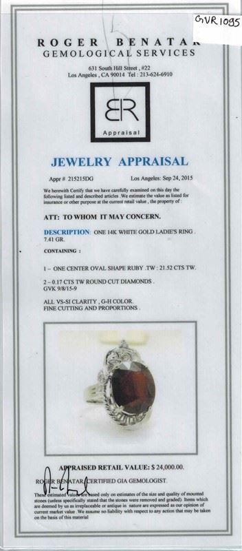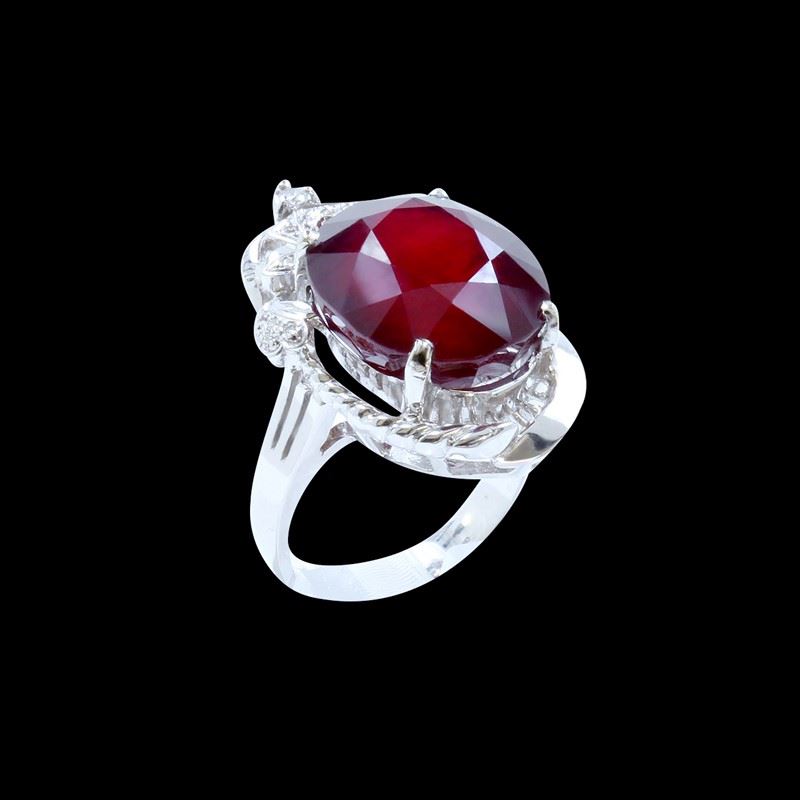 14K WHITE GOLD RUBY RING : 7.41 GRAMS / DIAMOND : 0.17CT / RUBY : 21.52CT / #GVR1095 **Artfully crafted in warm 14K white gold, this handsome style features a show-stopping 21.52ct Oval Shape Deep Red Ruby center stone. Rubies speak of the sensual pleasures of life- of beauty and the expression of one's creative energy. This cocktail ring is an investment piece. Shimmering 0.17ct Round Cut Diamond accents surround, adding a touch of subtle sparkle, while nugget-textured detailing adorns the ring's stepped shank.**