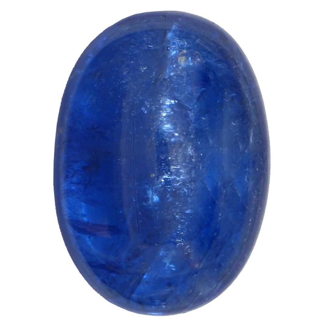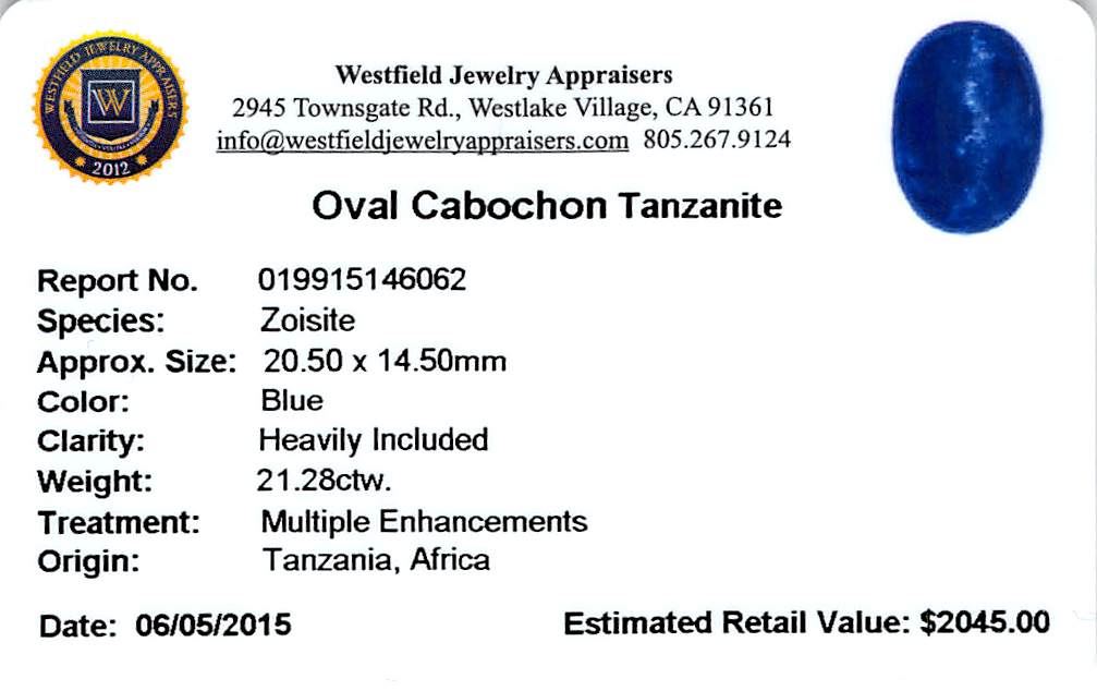 One oval cabochon cut natural tanzanite, measuring 20.50 x 14.50 x 7.50mm, exact weight 21.28ct., clarity is heavily included, type I, dark, very slightly grayish, blue color, (GIA B 7/3), cut is good. Transmitting light somewhat diffusely, transparent to translucent. Naturally occurring internal & external characteristics are present. Indications of heat treatment. Westfield Appraised at $2,045.00.