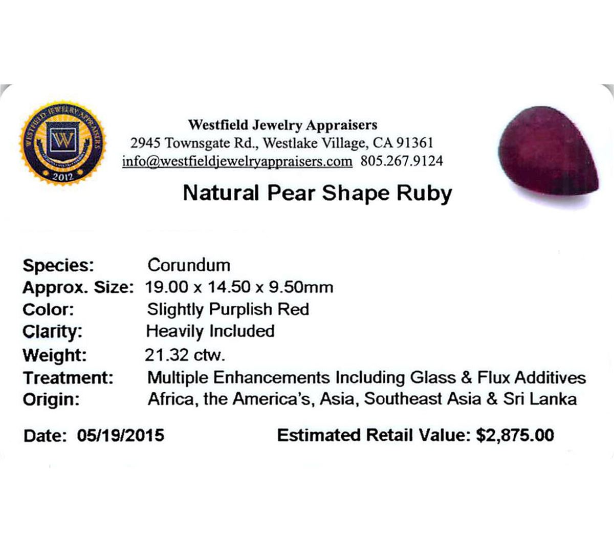 One pear mixed cut natural ruby, measuring 19.00 x 14.50 x 9.50mm, exact weight 21.32ct., clarity is heavily included, type II, dark, very slightly brownish, slightly purplish red color, (GIA slpR 7/3), cut is good. Transmitting light somewhat diffusely, transparent to translucent. Naturally occurring internal & external characteristics are present. Indications of laboratory high temperature heat treatment, with glass & flux additives. Ruby has a low tolerance to rhodium plating, repolishing the surface, & ultrasonic cleaning. Westfield Appraised at $2,875.00.