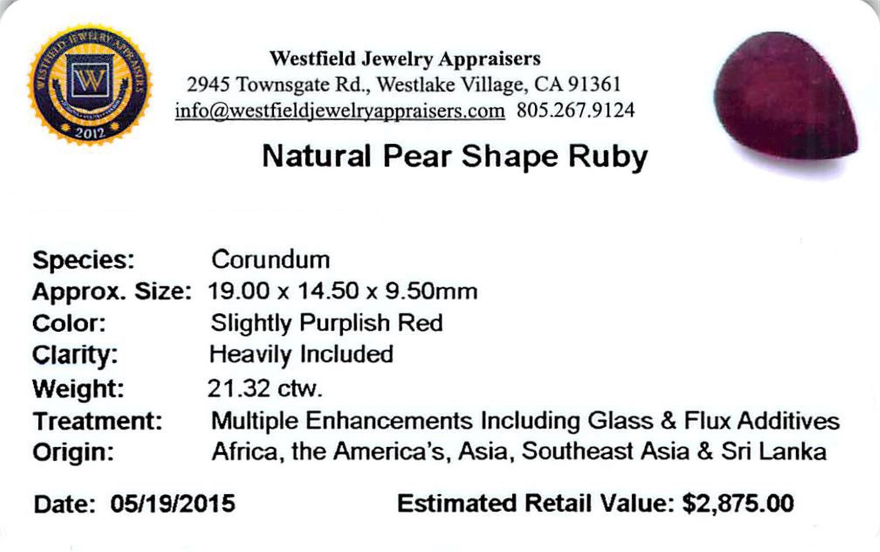 One pear mixed cut natural ruby, measuring 19.00 x 14.50 x 9.50mm, exact weight 21.32ct., clarity is heavily included, type II, dark, very slightly brownish, slightly purplish red color, (GIA slpR 7/3), cut is good. Transmitting light somewhat diffusely, transparent to translucent. Naturally occurring internal & external characteristics are present. Indications of laboratory high temperature heat treatment, with glass & flux additives. Ruby has a low tolerance to rhodium plating, repolishing the surface, & ultrasonic cleaning. Westfield Appraised at $2,875.00.