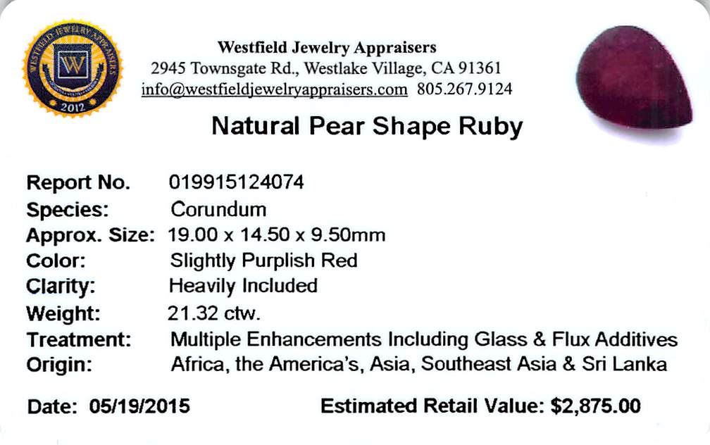 One pear mixed cut natural ruby, measuring 19.00 x 14.50 x 9.50mm, exact weight 21.32ct., clarity is heavily included, type II, dark, very slightly brownish, slightly purplish red color, (GIA slpR 7/3), cut is good. Transmitting light somewhat diffusely, transparent to translucent. Naturally occurring internal & external characteristics are present. Indications of laboratory high temperature heat treatment, with glass & flux additives. Ruby has a low tolerance to rhodium plating, repolishing the surface, & ultrasonic cleaning. Westfield Appraised at $2,875.00.
