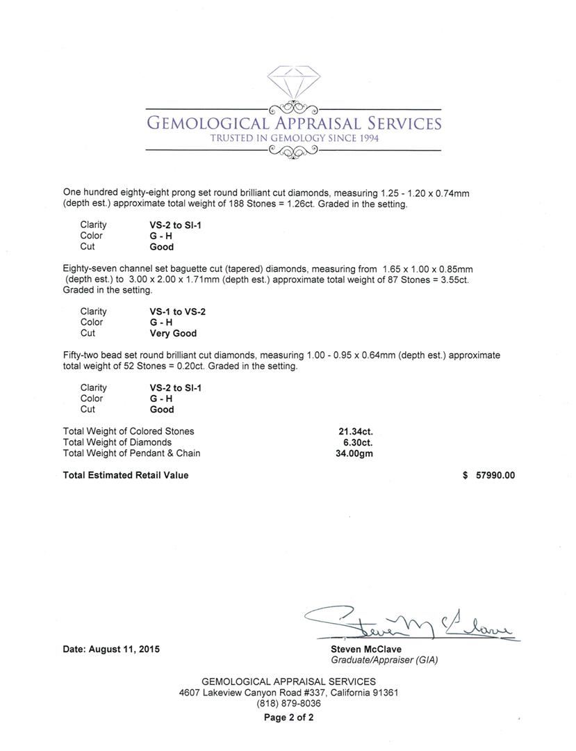 One electronically tested 14KT white gold lady's combination cast & assembled fashion pendant & chain 18.0" long, 2.05mm twisted rope chain with a lobster claw clasp with a bright polish finish. Identified with markings of "14K". Condition is new, good workmanship. Containing: One prong set oval modified brilliant cut natural tanzanite, measuring 19.00 x 14.34 x 10.77mm, 5% bulge factor, approximate weight of 21.34ct., clarity is eye clean, type I, dark, violet color, (GIA V 7/0), cut is very good. Transmitting light with no distortion, transparent. Colored gemstones are presumed to have been subjected to commonly used enhancement processes. Graded loose prior to setting in the GIA Laboratory, Report #2175177285.Four round brilliant cut diamonds, measuring 3.55 - 3.50 x 2.12mm (depth est.) approximate total weight of 4 Stones = 0.64ct. Graded in the setting. Four prong set round brilliant cut diamonds, measuring 2.60 - 2.50 x 1.53mm (depth est.) approximate total weight of 4 Stones = 0.25ct. Graded in the setting. Clarity: VS-2 to SI-1. Color: G - H. Cut Good Twenty-Six prong set round brilliant cut diamonds, measuring 1.70 - 1.50 x 0.96mm (depth est.) approximate total weight of 26 Stones = 0.40ct. Graded in the setting. Clarity: VS-2 to SI-1. Color: G - Good One Hundred Eighty-Eight prong set round brilliant cut diamonds, measuring 1.25 - 1.20 x 0.74mm (depth est.) approximate total weight of 188 Stones = 1.26ct. Graded in the setting. Clarity: VS-2 to SI-1. Color: G - Good Eighty-Seven channel set baguette cut (tapered) diamonds, measuring from 1.65 x 1.00 x 0.85mm (depth est.) to 3.00 x 2.00 x 1.71mm (depth est.) approximate total weight of 87 Stones = 3.55ct. Graded in the setting. Clarity: VS-1 to VS-2. Color: G - Very Good Fifty-Two bead set round brilliant cut diamonds, measuring 1.00 - 0.95 x 0.64mm (depth est.) approximate total weight of 52 Stones = 0.20ct. Graded in the setting. Clarity: VS-2 to SI-1. Color: G - Good. Total Weight of Colored Stones 21.34ct. Total Weight of Diamonds 6.30ct. Total Weight of Pendant & Chain 34.00gm. GAS Appraised at $57,990.00.