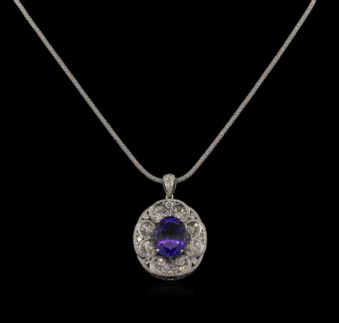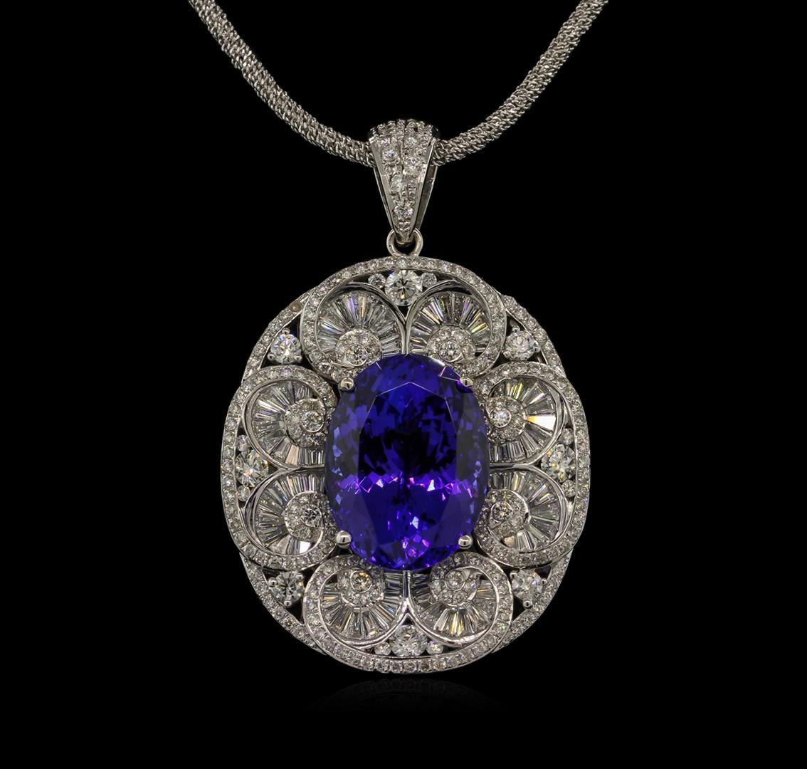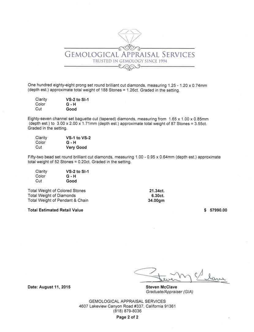 One electronically tested 14KT white gold lady's combination cast & assembled fashion pendant & chain 18.0" long, 2.05mm twisted rope chain with a lobster claw clasp with a bright polish finish. Identified with markings of "14K". Condition is new, good workmanship. Containing: One prong set oval modified brilliant cut natural tanzanite, measuring 19.00 x 14.34 x 10.77mm, 5% bulge factor, approximate weight of 21.34ct., clarity is eye clean, type I, dark, violet color, (GIA V 7/0), cut is very good. Transmitting light with no distortion, transparent. Colored gemstones are presumed to have been subjected to commonly used enhancement processes. Graded loose prior to setting in the GIA Laboratory, Report #2175177285.Four round brilliant cut diamonds, measuring 3.55 - 3.50 x 2.12mm (depth est.) approximate total weight of 4 Stones = 0.64ct. Graded in the setting. Four prong set round brilliant cut diamonds, measuring 2.60 - 2.50 x 1.53mm (depth est.) approximate total weight of 4 Stones = 0.25ct. Graded in the setting. Clarity: VS-2 to SI-1. Color: G - H. Cut Good Twenty-Six prong set round brilliant cut diamonds, measuring 1.70 - 1.50 x 0.96mm (depth est.) approximate total weight of 26 Stones = 0.40 ct. Graded in the setting. Clarity: VS-2 to SI-1. Color: G - Good One Hundred Eighty-Eight prong set round brilliant cut diamonds, measuring 1.25 - 1.20 x 0.74mm (depth est.) approximate total weight of 188 Stones = 1.26ct. Graded in the setting. Clarity: VS-2 to SI-1. Color: G - Good Eighty-Seven channel set baguette cut (tapered) diamonds, measuring from 1.65 x 1.00 x 0.85mm (depth est.) to 3.00 x 2.00 x 1.71mm (depth est.) approximate total weight of 87 Stones = 3.55ct. Graded in the setting. Clarity: VS-1 to VS-2. Color: G - Very Good Fifty-Two bead set round brilliant cut diamonds, measuring 1.00 - 0.95 x 0.64mm (depth est.) approximate total weight of 52 Stones = 0.20 ct. Graded in the setting. Clarity: VS-2 to SI-1. Color: G - Good. Total Weight of Colored Stones 21.34ct. Total Weight of Diamonds 6.30 ct. Total Weight of Pendant & Chain 34.00gm. GAS Appraised.