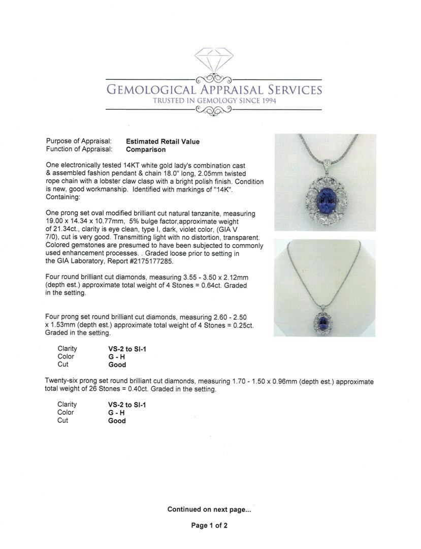 One electronically tested 14KT white gold lady's combination cast & assembled fashion pendant & chain 18.0" long, 2.05mm twisted rope chain with a lobster claw clasp with a bright polish finish. Identified with markings of "14K". Condition is new, good workmanship. Containing: One prong set oval modified brilliant cut natural tanzanite, measuring 19.00 x 14.34 x 10.77mm, 5% bulge factor, approximate weight of 21.34ct., clarity is eye clean, type I, dark, violet color, (GIA V 7/0), cut is very good. Transmitting light with no distortion, transparent. Colored gemstones are presumed to have been subjected to commonly used enhancement processes. Graded loose prior to setting in the GIA Laboratory, Report #2175177285.Four round brilliant cut diamonds, measuring 3.55 - 3.50 x 2.12mm (depth est.) approximate total weight of 4 Stones = 0.64ct. Graded in the setting. Four prong set round brilliant cut diamonds, measuring 2.60 - 2.50 x 1.53mm (depth est.) approximate total weight of 4 Stones = 0.25ct. Graded in the setting. Clarity: VS-2 to SI-1. Color: G - H. Cut Good Twenty-Six prong set round brilliant cut diamonds, measuring 1.70 - 1.50 x 0.96mm (depth est.) approximate total weight of 26 Stones = 0.40 ct. Graded in the setting. Clarity: VS-2 to SI-1. Color: G - Good One Hundred Eighty-Eight prong set round brilliant cut diamonds, measuring 1.25 - 1.20 x 0.74mm (depth est.) approximate total weight of 188 Stones = 1.26ct. Graded in the setting. Clarity: VS-2 to SI-1. Color: G - Good Eighty-Seven channel set baguette cut (tapered) diamonds, measuring from 1.65 x 1.00 x 0.85mm (depth est.) to 3.00 x 2.00 x 1.71mm (depth est.) approximate total weight of 87 Stones = 3.55ct. Graded in the setting. Clarity: VS-1 to VS-2. Color: G - Very Good Fifty-Two bead set round brilliant cut diamonds, measuring 1.00 - 0.95 x 0.64mm (depth est.) approximate total weight of 52 Stones = 0.20 ct. Graded in the setting. Clarity: VS-2 to SI-1. Color: G - Good. Total Weight of Colored Stones 21.34ct. Total Weight of Diamonds 6.30 ct. Total Weight of Pendant & Chain 34.00gm. GAS Appraised.