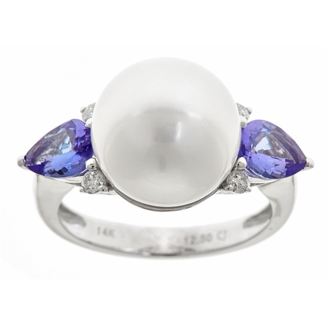 One South Sea Pearl, Morganite, and Diamond Ring featuring: 14K Rose Gold with a total weight of 3.46 grams, One South Sea Pearl with a total weight of 21.34ct, Two Morganite Stones with a total weight of 1.14ctw, and Four Round Cut Diamonds with a total weight of 0.17ctw.