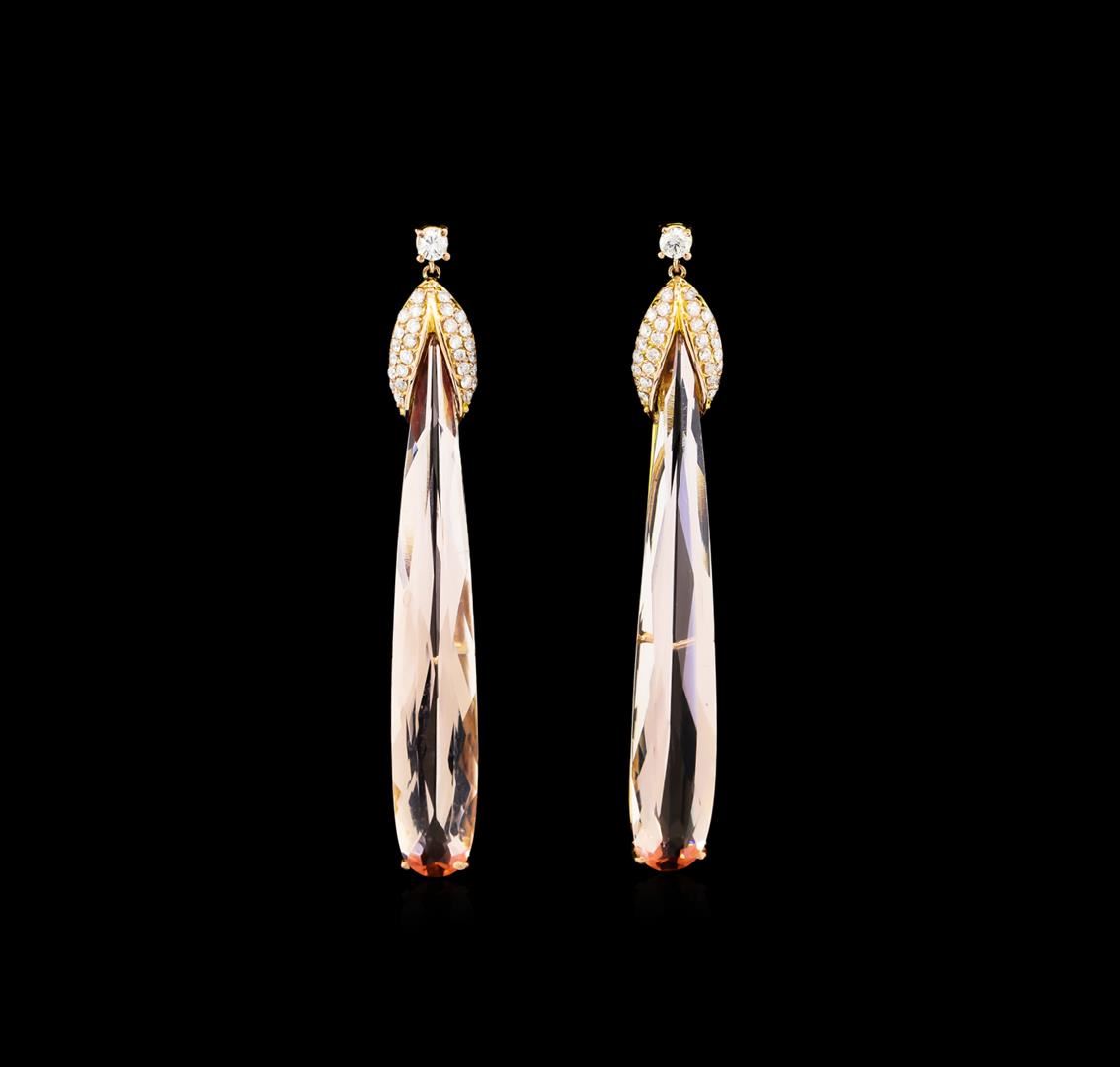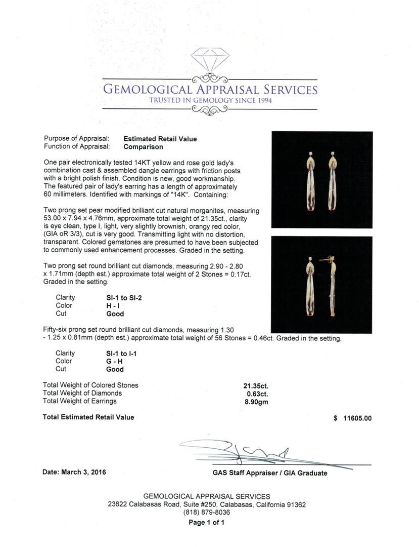 One pair electronically tested 14KT yellow and rose gold lady's combination cast & assembled dangle earrings with friction posts with a bright polish finish. The featured pair of lady's earring has a length of approximately 60 millimeters. Identified with markings of "14K". Condition is new, good workmanship. Containing: Two prong set pear modified brilliant cut natural morganites, measuring 53.00 x 7.94 x 4.76mm, approximate total weight of 21.35ct., clarity is eye clean, type I, light, very slightly brownish, orangy red color, (GIA oR 3/3), cut is very good. Transmitting light with no distortion, transparent. Colored gemstones are presumed to have been subjected to commonly used enhancement processes. Graded in the setting. Two prong set round brilliant cut diamonds, measuring 2.90 - 2.80 x 1.71mm (depth est.) approximate total weight of 2 Stones = 0.17ct. Graded in the setting. Clarity: SI-1 to SI-2. Color: H - I. Cut Good Fifty-Six prong set round brilliant cut diamonds, measuring 1.30 - 1.25 x 0.81mm (depth est.) approximate total weight of 56 Stones = 0.46ct. Graded in the setting. Clarity: SI-1 to I-1. Color: G - H. Cut Good. Total Weight of Colored Stones 21.35ct. Total Weight of Diamonds 0.63ct. Total Weight of Earrings 8.90gm. GAS Appraised at $11,605.00.