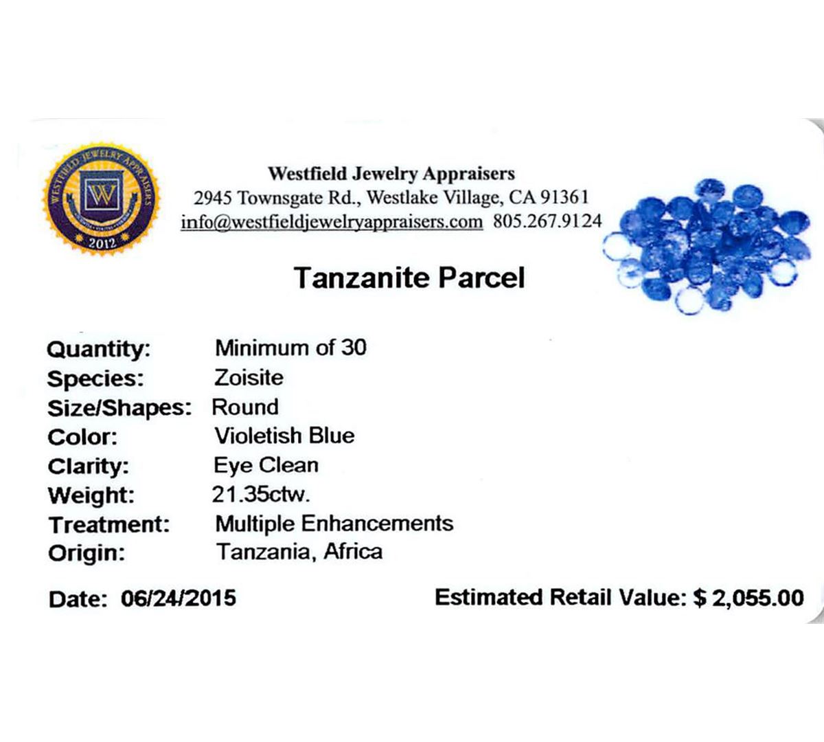 Thirty round mixed cut natural tanzanites, measuring 5.00 - 5.00 x 4.00 mm, exact total weight 21.35ct., clarity is slightly included, type I, medium dark, very slightly grayish, violetish blue color, (GIA vB 6/3), cut is good. Measurements & the color grade are an average for the group, Color grade is an average for the group, Transmitting light with no distortion, transparent, Naturally occurring internal & external characteristics are present, Indications of multiple laboratory enhancements, including high temperature heat treatment. Westfield Appraised at $2,055.00.