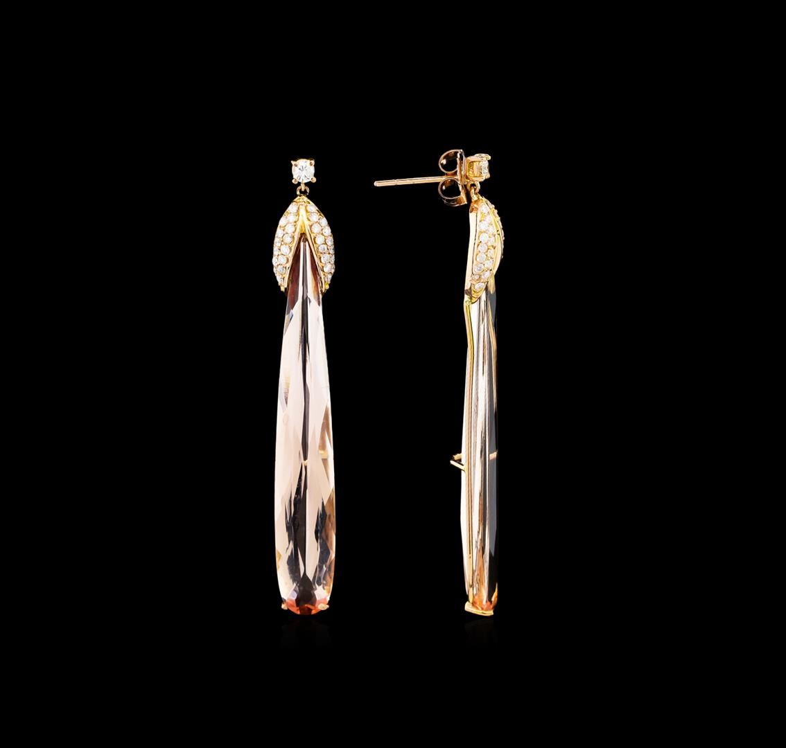 One pair electronically tested 14KT yellow and rose gold lady's combination cast & assembled dangle earrings with friction posts with a bright polish finish. The featured pair of lady's earring has a length of approximately 60 millimeters. Identified with markings of "14K". Condition is new, good workmanship. Containing: Two prong set pear modified brilliant cut natural morganites, measuring 53.00 x 7.94 x 4.76mm, approximate total weight of 21.35ct., clarity is eye clean, type I, light, very slightly brownish, orangy red color, (GIA oR 3/3), cut is very good. Transmitting light with no distortion, transparent. Colored gemstones are presumed to have been subjected to commonly used enhancement processes. Graded in the setting. Two prong set round brilliant cut diamonds, measuring 2.90 - 2.80 x 1.71mm (depth est.) approximate total weight of 2 Stones = 0.17ct. Graded in the setting. Clarity: SI-1 to SI-2. Color: H - I. Cut Good Fifty-Six prong set round brilliant cut diamonds, measuring 1.30 - 1.25 x 0.81mm (depth est.) approximate total weight of 56 Stones = 0.46ct. Graded in the setting. Clarity: SI-1 to I-1. Color: G - H. Cut Good. Total Weight of Colored Stones 21.35ct. Total Weight of Diamonds 0.63ct. Total Weight of Earrings 8.90gm. GAS Appraised at $11,605.00.