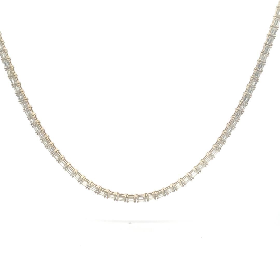 Make an unforgettable statement with this breathtaking 18KT yellow gold eternity necklace. Featuring a polished finish, basket motif, and tongue clasp with fold-under safety, this 19.5-inch necklace showcases 122 prong-set baguette cut diamonds totaling 21.41 carats, graded VS-1 to VS in clarity and H-K in color. This elegant piece is crafted to impress and elevate any formal attire.