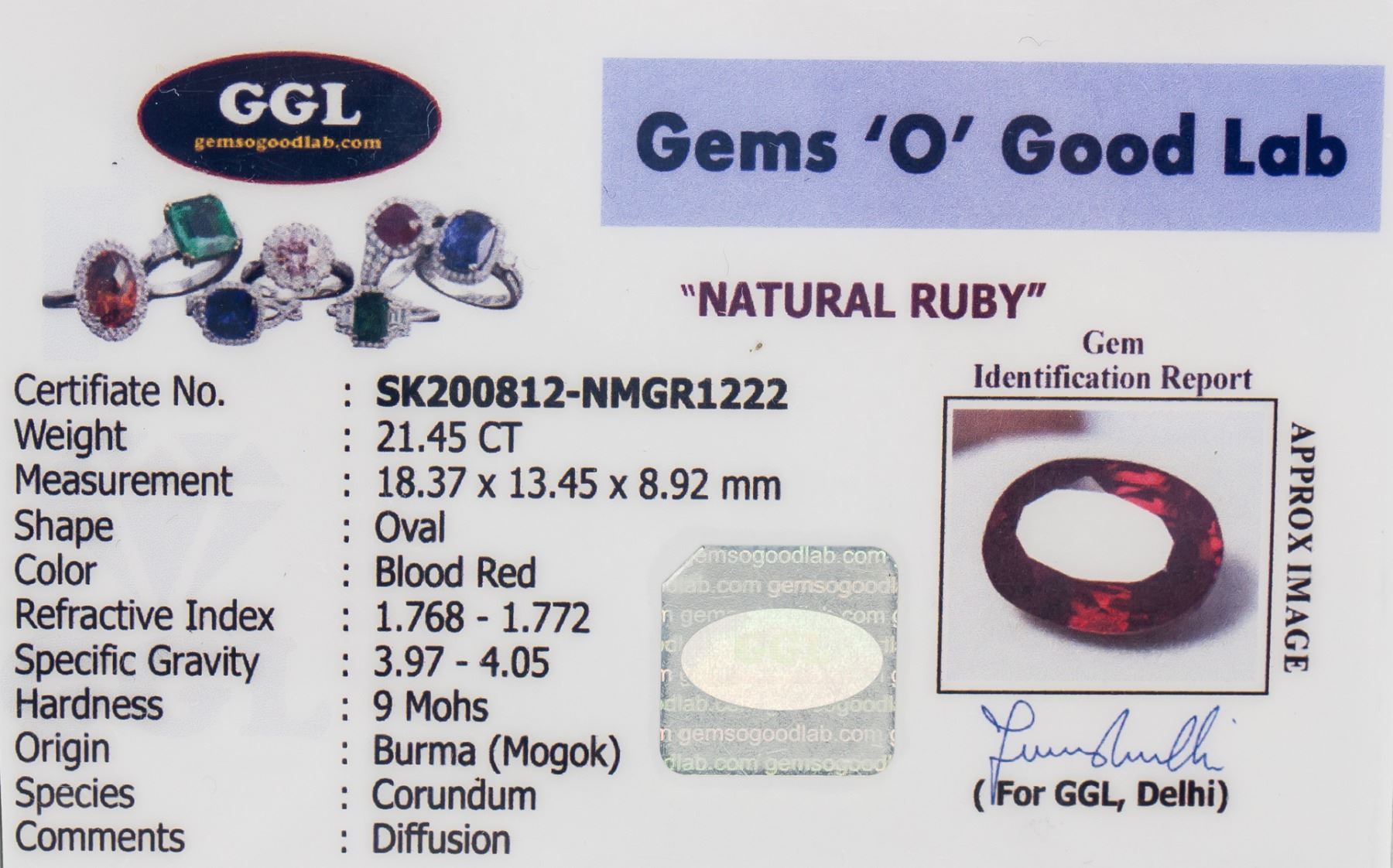 One (1) 21.45 ct oval cut blood red natural ruby. Origin: Burma (Mogok). Accompanied with GGL certificate. 18.37 x 13.45 x 8.92 mm.