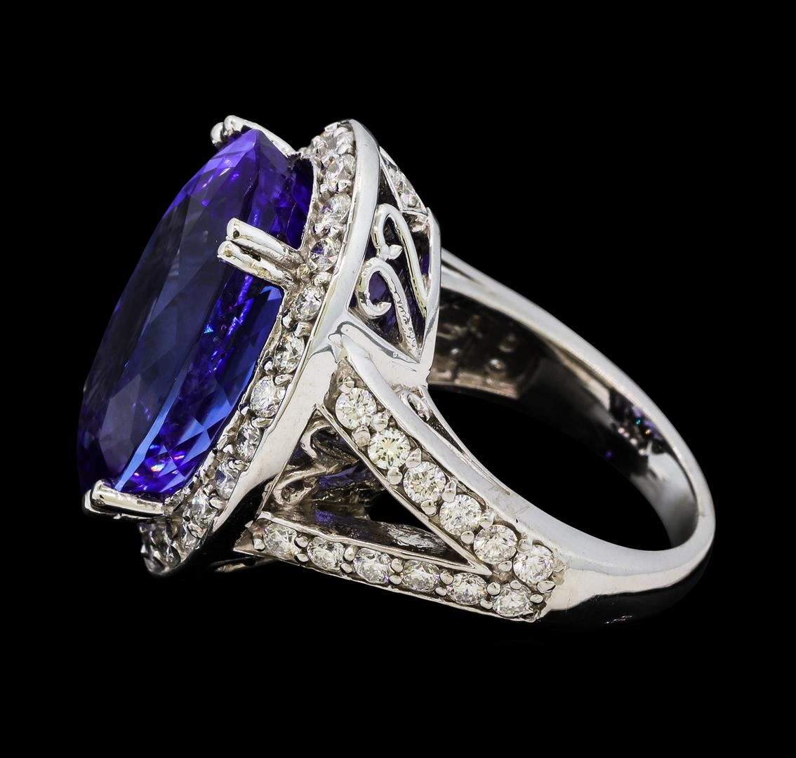 One electronically tested 14KT white gold lady's cast fashion ring with a split shank basket halo with a bright polish finish. The featured lady's ring has gallery with scroll accents and a shank measuring 2.95 millimeters wide. Identified with markings of '14K'. Condition is new, good workmanship. Containing: One prong set oval modified brilliant cut natural tanzanite, measuring 19.91 x 14.58 x 10.20mm, (depth est.) 3%. bulge factor, approximate weight of 21.48ct., clarity is eye clean, medium dark, moderately strong, bluish violet color, (GIA bV 6/4), cut is very good. Transmitting light with no distortion, transparent. Colored gemstones are presumed to have been subjected to commonly used enhancement processes. Graded in the setting. Fifty bead set round brilliant cut diamonds, measuring 2.05 - 1.95 x 1.20mm (depth est.) approximate total weight of 50 Stones = 1.47ct. Graded in the setting. Clarity SI-1 to I-1. Color: G - I Cut Good Two prong set round brilliant cut diamonds, measuring 1.80 - 1.75 x 1.07mm (depth est.) approximate total weight of 2 Stones = 0.04ct. Graded in the setting. Clarity SI-1 to SI-2. Color: H - I Cut Good. Total Weight of Colored Stones 21.48ct.. Total Weight of Diamonds 1.51ct.. Total Weight of Ring 17.20gm. GAS Appraised at $23,925.00.
