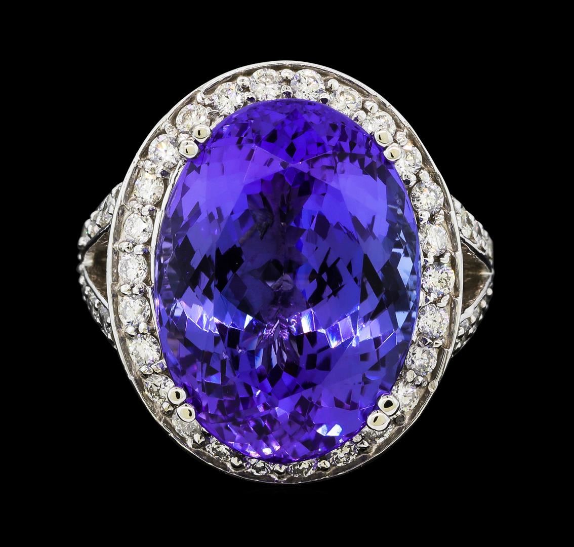 One electronically tested 14KT white gold lady's cast fashion ring with a split shank basket halo with a bright polish finish. The featured lady's ring has gallery with scroll accents and a shank measuring 2.95 millimeters wide. Identified with markings of '14K'. Condition is new, good workmanship. Containing: One prong set oval modified brilliant cut natural tanzanite, measuring 19.91 x 14.58 x 10.20mm, (depth est.) 3%. bulge factor, approximate weight of 21.48ct., clarity is eye clean, medium dark, moderately strong, bluish violet color, (GIA bV 6/4), cut is very good. Transmitting light with no distortion, transparent. Colored gemstones are presumed to have been subjected to commonly used enhancement processes. Graded in the setting. Fifty bead set round brilliant cut diamonds, measuring 2.05 - 1.95 x 1.20mm (depth est.) approximate total weight of 50 Stones = 1.47ct. Graded in the setting. Clarity SI-1 to I-1. Color: G - I Cut Good Two prong set round brilliant cut diamonds, measuring 1.80 - 1.75 x 1.07mm (depth est.) approximate total weight of 2 Stones = 0.04ct. Graded in the setting. Clarity SI-1 to SI-2. Color: H - I Cut Good. Total Weight of Colored Stones 21.48ct.. Total Weight of Diamonds 1.51ct.. Total Weight of Ring 17.20gm. GAS Appraised at $23,925.00.
