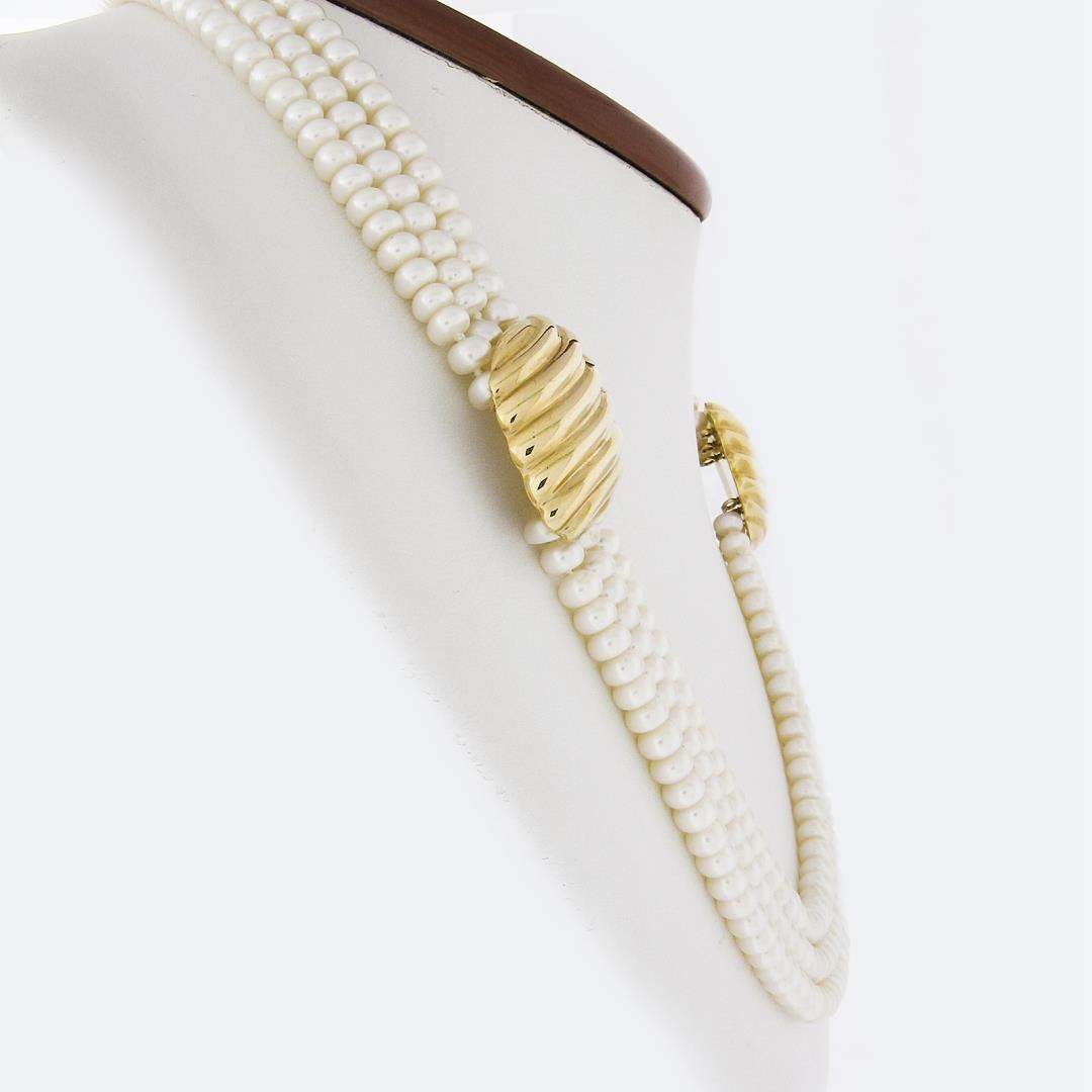 A 3 row strand necklace with solid 14k yellow gold stations and clasp, with numeroud of semi round cultured pearls (5mm to 5.25mm each). It weighs a total of 73.48 grams, measures 21.3mm wide, and measures 21.5 inches in length.