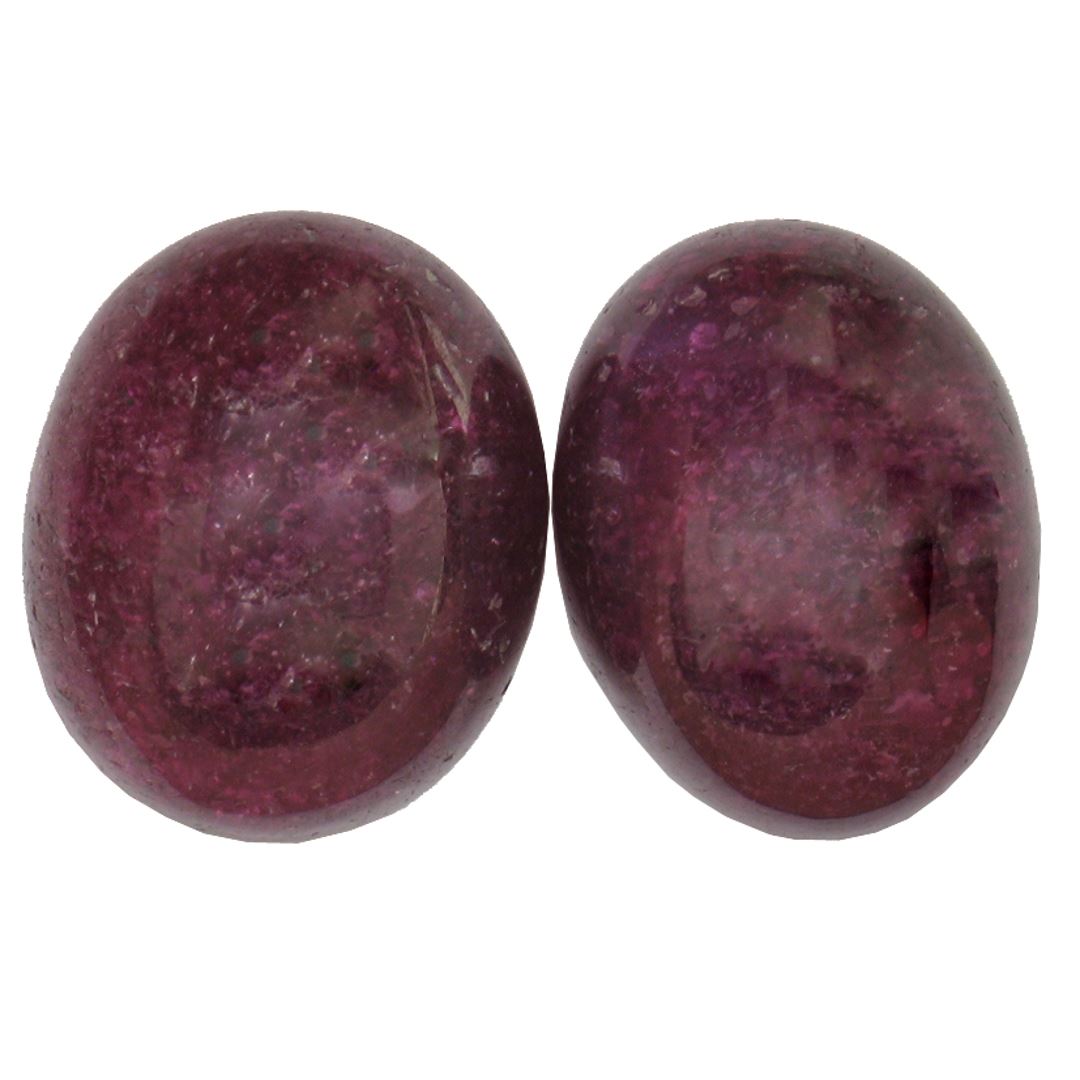 Two oval cabochon cut natural rubies, measuring 13.50 x 10.40 x 6.90mm, exact total weight 21.56ct., clarity is heavily included, type II, dark, very slightly brownish, slightly purplish red color, (GIA slpR 7/3), cut is good. Transmitting light diffusely, opaque. Naturally occurring internal & external characteristics are present. Indications of laboratory high temperature heat treatment, with glass & flux additives. Ruby has a low tolerance to rhodium plating, repolishing the surface, & ultrasonic cleaning. Westfield Appraised at $2,210.00.