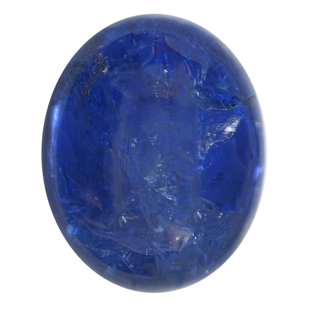 One oval cabochon cut natural tanzanite, measuring 17.00 x 14.00 x 9.00mm, exact weight 21.57ct., clarity is heavily included, type I, dark, very slightly grayish, blue color, (GIA B 7/3), cut is good. Transmitting light somewhat diffusely, transparent to translucent. Naturally occurring internal & external characteristics are present. Indications of heat treatment. Westfield Appraised at $2,070.00.