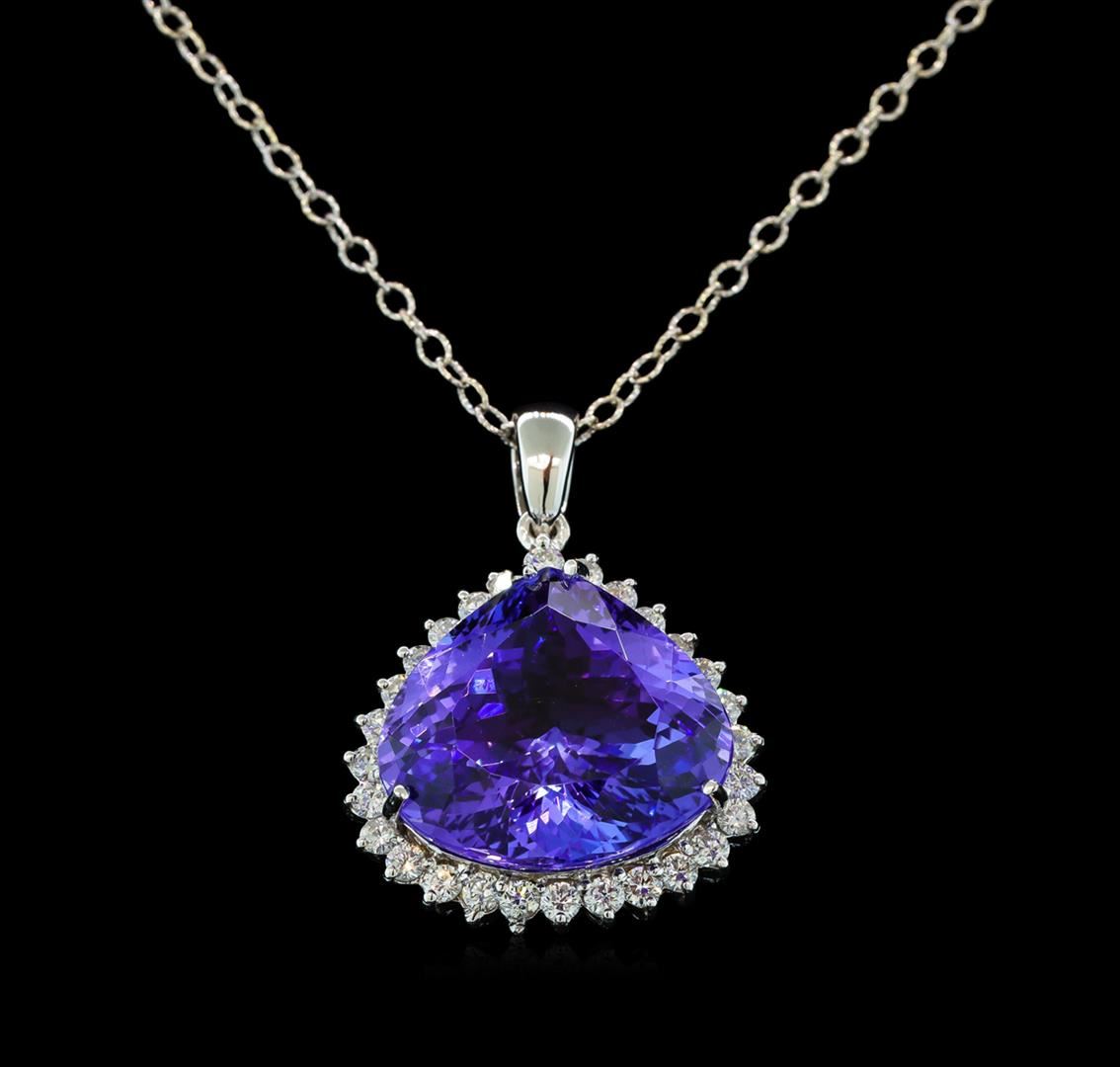 One electronically tested 14KT white gold lady's combination cast & assembled fashion pendant & chain 18.0' long, 2mm twisted oval cable link with a lobster claw clasp with a basket halo with a bright polish finish. Identified with markings of '14K'. Condition is new, good workmanship. Containing: One prong set pear modified brilliant cut natural tanzanite, measuring 17.90 x 19.36 x 10.00mm, (depth est.) approximate weight of 21.58ct., clarity is eye clean, medium, moderately strong, violet color, (GIA V 5/4), cut is very good. Transmitting light with no distortion, transparent. Colored gemstones are presumed to have been subjected to commonly used enhancement processes. Graded loose prior to setting in the GIA Laboratory, Report #2175668699. Twenty-Eight prong set round brilliant cut diamonds, measuring 2.20 - 2.15 x 1.35mm (depth est.) approximate total weight of 28 Stones = 1.10ct. Graded in the setting. Clarity SI-1 to SI-2. Color: H - I Cut Good. Total Weight of Colored Stones 21.58ct.. Total Weight of Diamonds 1.10ct.. Total Weight of Pendant & Chain 12.00gm GAS Appraised at $27,020.00.