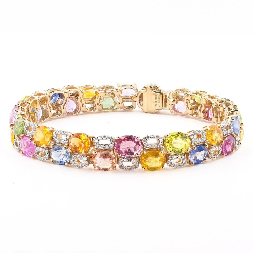 Fourteen karat (14K) yellow gold natural multi color sapphire corundum and diamond bracelet. Oval brilliant cut natural multi color sapphire corundum gemstones are mounted in the center of the bracelet. Round brilliant cut diamonds accent the bracelet between the center gemstones. The bracelet has a gross weight of 19.2 Grams. Brand: Oscar Friedman #NATURAL GEMSTONE# GEMSTONE: Sapphire Corundum NATURE: Natural SHAPE: Oval Brilliant, Faceted Cut WEIGHT: 21.60 carat total (31pcs.) DIMENSIONS: 6.1 x 4.0mm CLARITY: Type 2/3 COLOR: Multi Color (5/5) SYMMETRY: Excellent COLOR INTENSITY: Intense TRANSPARENCY: Transparent TONE: Light-Dark #NATURAL DIAMOND# SHAPE: Round Brilliant Cut WEIGHT: 1.41 carat total (279pcs.) DIMENSIONS: 1.0 x 0.9mm AVERAGE CLARITY: SI1-SI2 AVERAGE COLOR: G-H SYMMETRY: Excellent POLISH: Excellent #METAL# METAL: Gold PURITY: 14K COLOR: Yellow CONDITION: Excellent FINISH: High Polish #LREF-9113