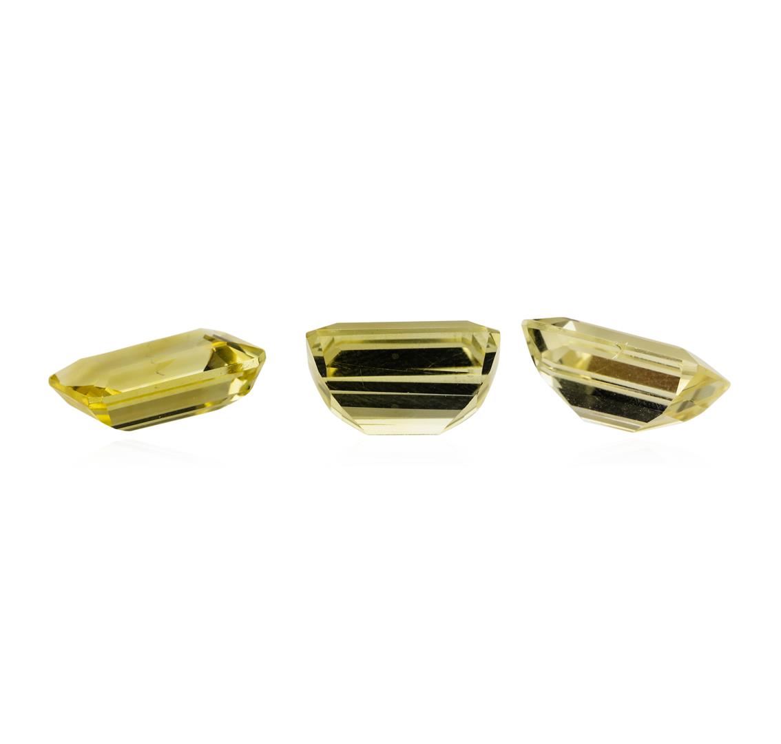 One natural emerald cut citrine quartz parcel of three with an exact weight of 21.68ctw., clarity is eye clean, slightly orangy yellow, medium light to light. Gemological Appraisals Services estimates the retail value at $650.4 GAS Appraised.