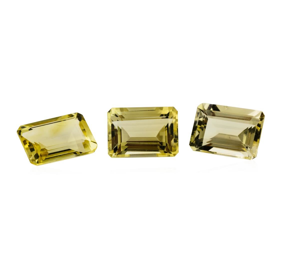 One natural emerald cut citrine quartz parcel of three with an exact weight of 21.68ctw., clarity is eye clean, slightly orangy yellow, medium light to light. Gemological Appraisals Services estimates the retail value at $650.4 GAS Appraised.
