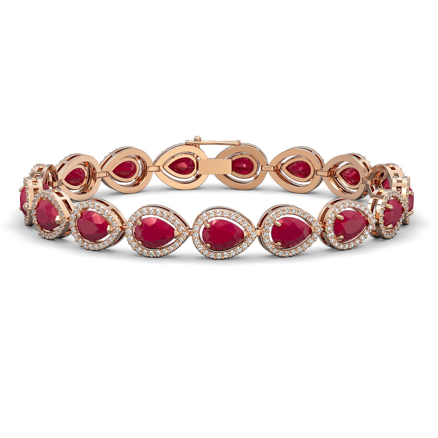 REF-315K5W -41094 ---- 21.69 CTW Ruby & Diamond Halo Bracelet 10K Rose Gold ---- Luxury Designer Brand Bracelet Appraised at $17,350 Certificate Number US41094 10k Rose gold, Bracelet Size is 7 Inches, Bracelet measuring approx. 9 mm x 7 Inches, weighing in total approx. 13 grams. Made in the USA and is stamped 10k, Main stone 18.7 carat total weight containing 17 pieces of Mid-Opaque-Deep Red color with AAA quality Pear shape cut Ruby , Stone #2 2.99 carat total weight containing 374 pieces of G-H color with VS/SI quality Round shape cut Diamond