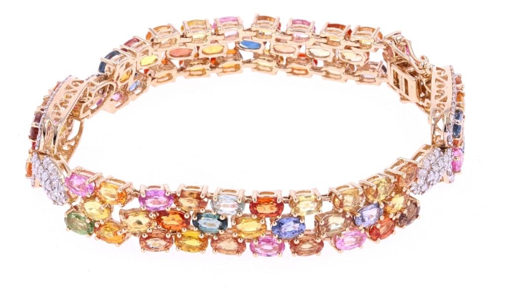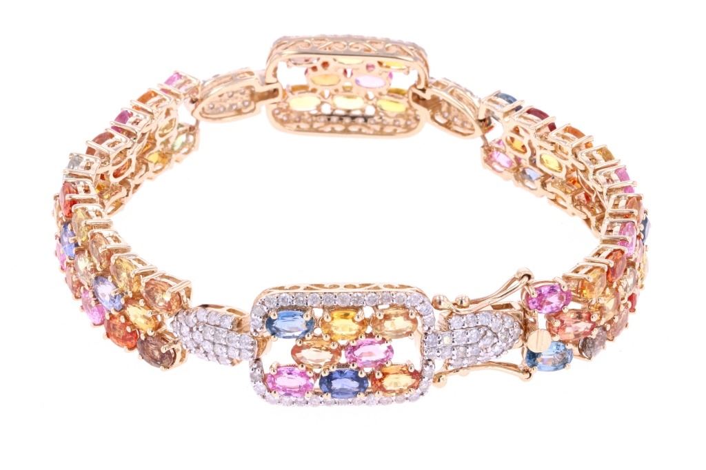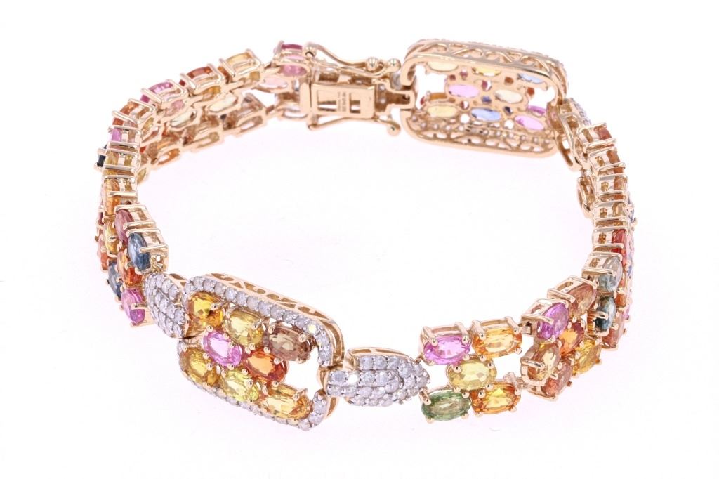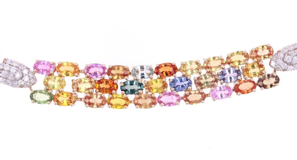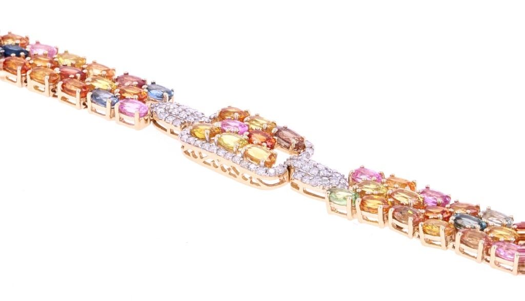 This is an outstanding and flamboyant, 21.70 carat, natural, multi-colored Sapphire and 1.49 carat Diamond bracelet with paperwork. The bracelet has an impressive multiple colored, three row design and unique buckle-like diamond encrusted accents set into 14 karat yellow gold and 14 karat white gold with a total of 21.5 grams in weight. The piece shows 74 oval brilliant cut, natural Sapphires, with a total weight of 21.70 carats and very good quality, in colors of blue, red, yellow, orange-yellow, orange, brownish orange, cornflower blue, violet, purple, Kashmir pink, and more. The bracelet is also set with 144 round brilliant natural Diamonds, totaling 1.49 carats, with I-1 to I-3 clarity and H to K color. The bracelet shows a multi-link design that is 7 inches in overall length and is in brand new condition from Luxury Designer Orianne Collins. It is hallmarked “ORIANNE 14K”. This is truly one of the most glamorous and unique bracelets we have offered. It displays well in a case or adorned on a wrist. The piece comes with a GIA Graduate Laboratories report from AIGL (American International Gemological Laboratory, INC. AIGL#: K55E95-EA14617) confirming the above information and giving a current value appraisal of $16,785.00. The bracelet is in pristine condition.