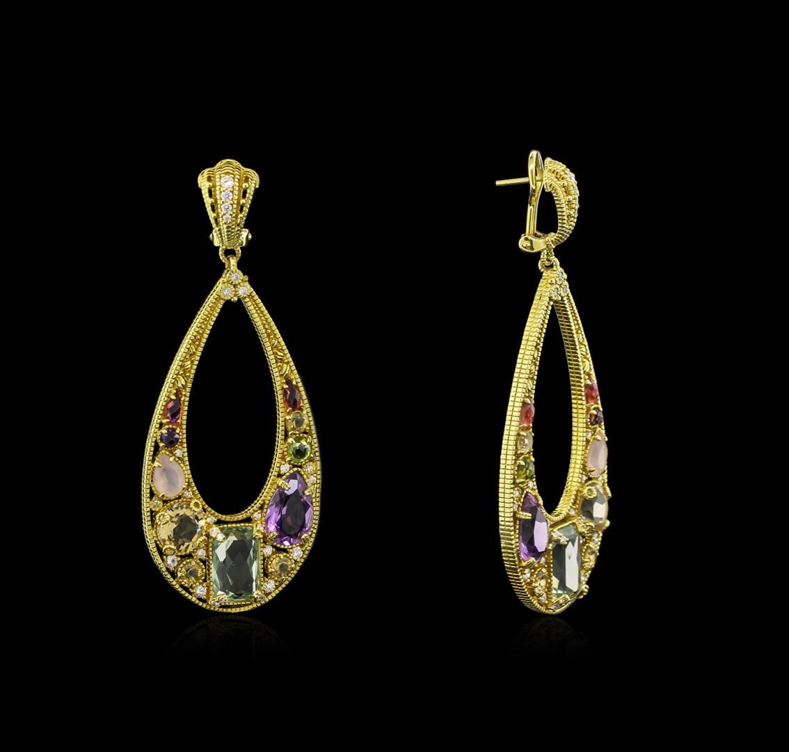 One pair electronically tested 18KT yellow gold ladies cast & assembled multi gemstone & diamond dangle earrings with omega back. The earrings are Ambrosia earrings from Judith Ripka's Monaco Collection. Each earring features a large open pear shaped drop accented by diamonds, amethyst, citrine, green quartz, peridot, pink tourmaline, rose quartz and lemon quartz. Bright polish finish. Trademark is JR. Identified with markings of "18K". Condition is good. Containing: Sixteen prong set round, pear and rectangular mixed cut natural multi color quartz approximate total weight of 20.56ct., cut is good. Transmitting light with no distortion, transparent. The group is composed of a mix of natural amethyst, citrine, green, lemon and rose quartz. Graded in the setting. Two prong set round mixed cut natural peridot, measuring 4.20 - 4.10 x 1.20 mm, approximate total weight of 0.30ct., clarity is eye clean, type II, medium dark, moderately strong, yellowish green color, (GIA yG 6/4), cut is good. Transmitting light with no distortion, transparent. Color grade is an average for the pair. Graded in the setting. Fur prong set pear mixed cut natural pink tourmalines, measuring 5.00 x 2.50 x 2.80mm, approximate total weight of 0.84ct., clarity is eye clean, type II, medium, moderately strong, slightly purplish red color, (GIA slpR 5/4), cut is good. Transmitting light with no distortion, transparent. Measurements & the color grade are an average for the group. Graded in the setting. This color of tourmaline is commonly irradiated to improve or change the color. Whether or not this gemstone has been irradiated cannot currently be determined. Sixty prong and bezel set round brilliant cut diamonds, measuring 2.00 - 1.80 x 1.14mm (depth est.) approximate total weight of 60 Stones = 1.50ct. Graded in the setting. Clarity: VS-1 to VS-2. Color: F - H. Total Weight of Colored Stones: 21.70 ct. Total Weight of Diamonds: 1.50 ct. Total Weight of Earrings: 35.03 gm. AIG Appraised at $9,800.00.