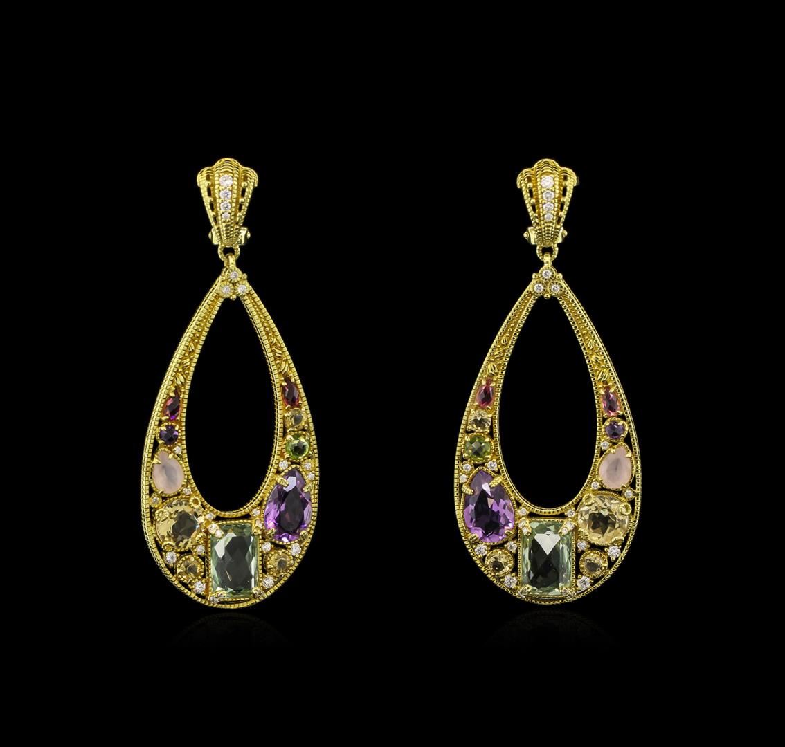 One pair electronically tested 18KT yellow gold ladies cast & assembled multi gemstone & diamond dangle earrings with omega back. The earrings are Ambrosia earrings from Judith Ripka's Monaco Collection. Each earring features a large open pear shaped drop accented by diamonds, amethyst, citrine, green quartz, peridot, pink tourmaline, rose quartz and lemon quartz. Bright polish finish. Trademark is JR. Identified with markings of "18K". Condition is good. Containing: Sixteen prong set round, pear and rectangular mixed cut natural multi color quartz approximate total weight of 20.56ct., cut is good. Transmitting light with no distortion, transparent. The group is composed of a mix of natural amethyst, citrine, green, lemon and rose quartz. Graded in the setting. Two prong set round mixed cut natural peridot, measuring 4.20 - 4.10 x 1.20 mm, approximate total weight of 0.30ct., clarity is eye clean, type II, medium dark, moderately strong, yellowish green color, (GIA yG 6/4), cut is good. Transmitting light with no distortion, transparent. Color grade is an average for the pair. Graded in the setting. Fur prong set pear mixed cut natural pink tourmalines, measuring 5.00 x 2.50 x 2.80mm, approximate total weight of 0.84ct., clarity is eye clean, type II, medium, moderately strong, slightly purplish red color, (GIA slpR 5/4), cut is good. Transmitting light with no distortion, transparent. Measurements & the color grade are an average for the group. Graded in the setting. This color of tourmaline is commonly irradiated to improve or change the color. Whether or not this gemstone has been irradiated cannot currently be determined. Sixty prong and bezel set round brilliant cut diamonds, measuring 2.00 - 1.80 x 1.14mm (depth est.) approximate total weight of 60 Stones = 1.50ct. Graded in the setting. Clarity: VS-1 to VS-2. Color: F - H. Total Weight of Colored Stones: 21.70 ct. Total Weight of Diamonds: 1.50 ct. Total Weight of Earrings: 35.03 gm. AIG Appraised at $9,800.00.