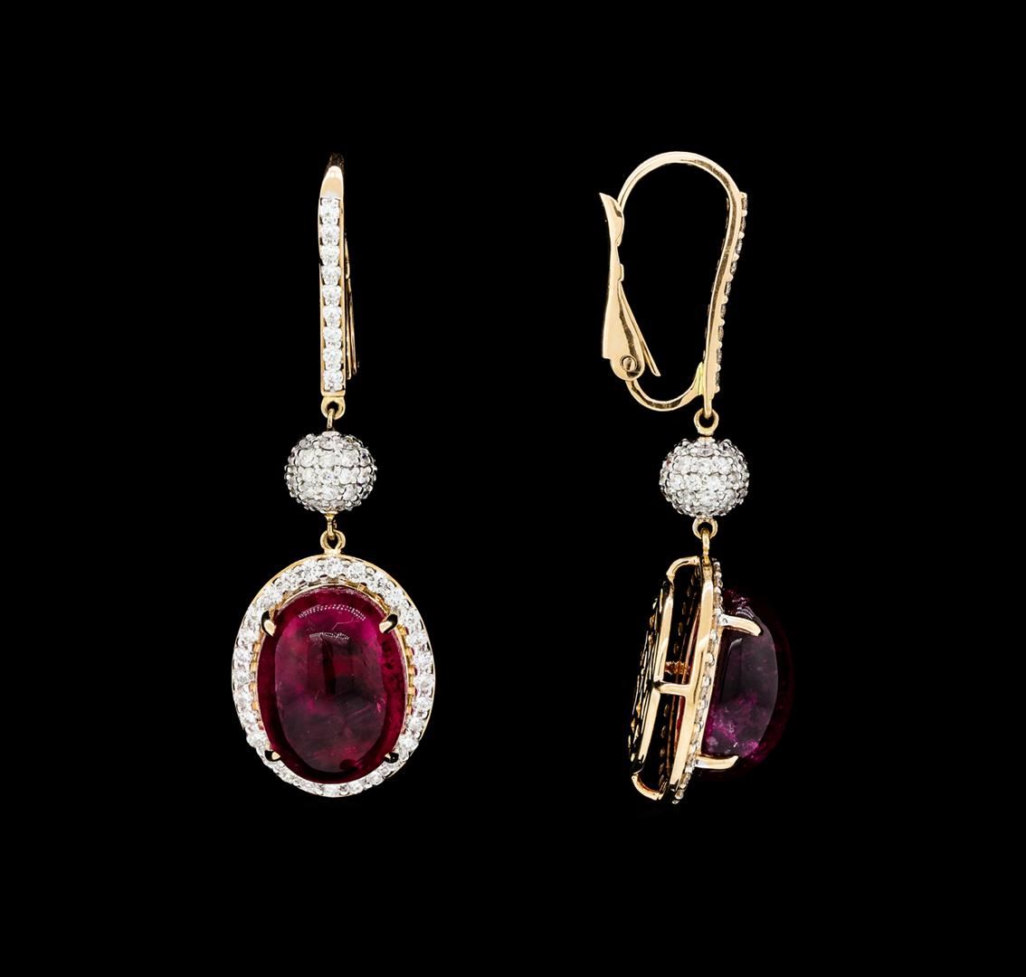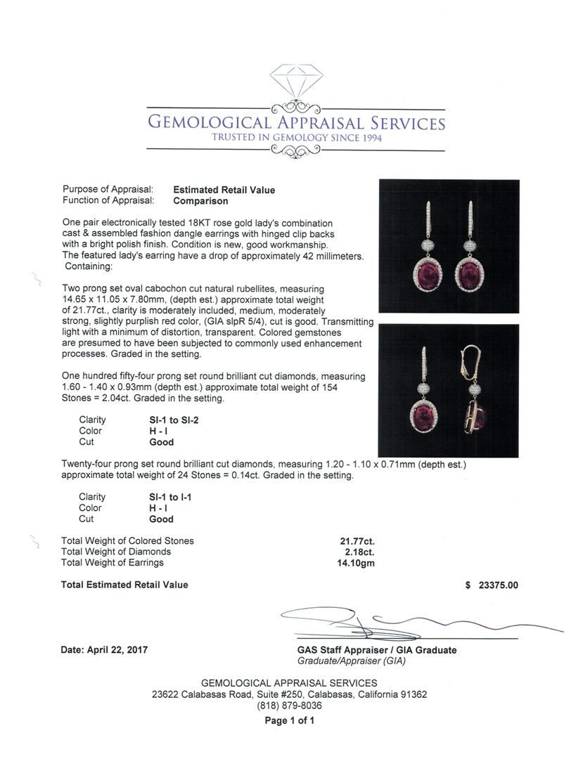 One pair electronically tested 18KT rose gold lady's combination cast & assembled fashion dangle earrings with hinged clip backs with a bright polish finish. The featured lady's earring have a drop of approximately 42 millimeters. Condition is new, good workmanship. Containing: Two prong set oval cabochon cut natural rubellites, measuring 14.65 x 11.05 x 7.80mm, (depth est.) approximate total weight of 21.77ct., clarity is moderately included, medium, moderately strong, slightly purplish red color, (GIA slpR 5/4), cut is good. Transmitting light with a minimum of distortion, transparent. Colored gemstones are presumed to have been subjected to commonly used enhancement processes. Graded in the setting. One Hundred Fifty-Four prong set round brilliant cut diamonds, measuring 1.60 - 1.40 x 0.93mm (depth est.) approximate total weight of 154 Stones = 2.04ct. Graded in the setting. Color H - I Clarity SI-1 to SI-2 Cut Good Twenty-Four prong set round brilliant cut diamonds, measuring 1.20 - 1.10 x 0.71mm (depth est.) approximate total weight of 24 Stones = 0.14ct. Graded in the setting. Color H - I Clarity SI-1 to I-1 Cut Good. Total Weight of Colored Stones 21.77ct.. Total Weight of Diamonds 2.18ct.. Total Weight of Earrings 14.10gm GAS Appraised at $23375.00. GAS Appraised at $23,375.00.