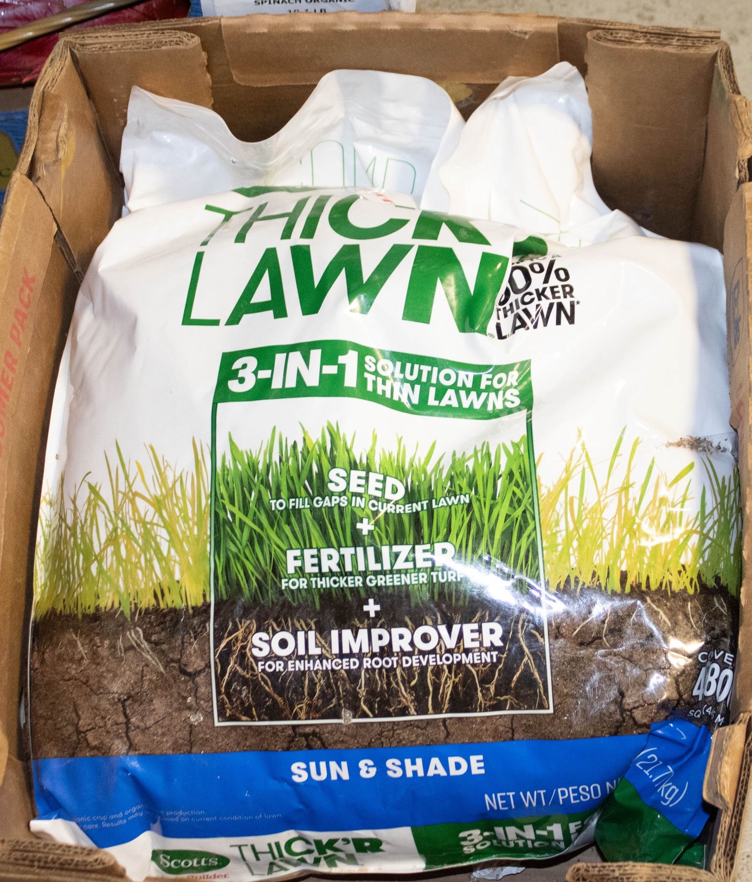 3-IN-1 SOLUTION FOR THIN LAWNS (OPENED) SCOTTS TURF BUILDER THICK'R LAWN SUN AND SHADE HAS EVERYTHING YOU NEED TO HELP TURN WEAK, THIN GRASS INTO A THICK, GREEN LAWN. WITH THIS 3-IN-1 SOLUTION GET UP TO A 50% THICKER LAWN WITH JUST ONE APPLICATION GU
