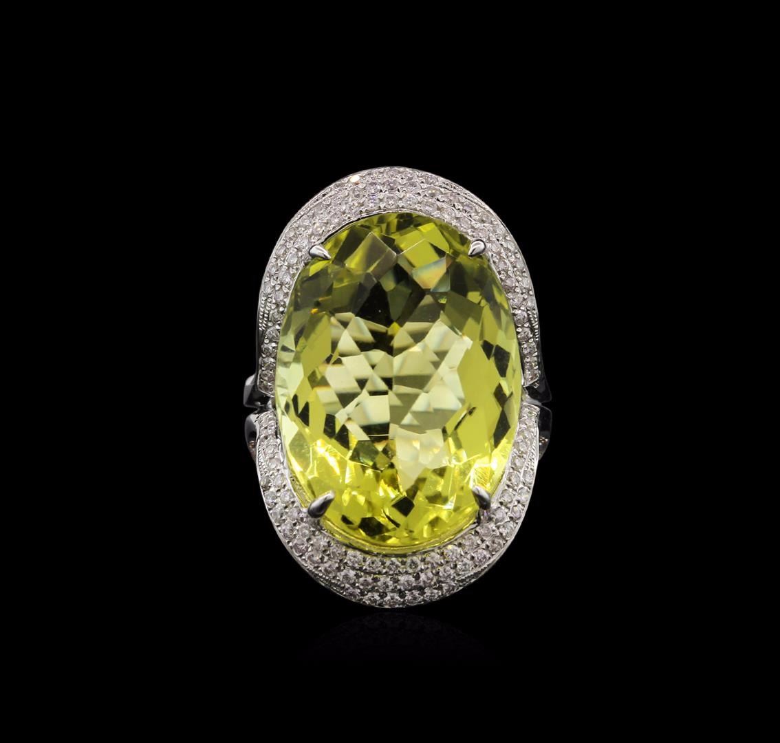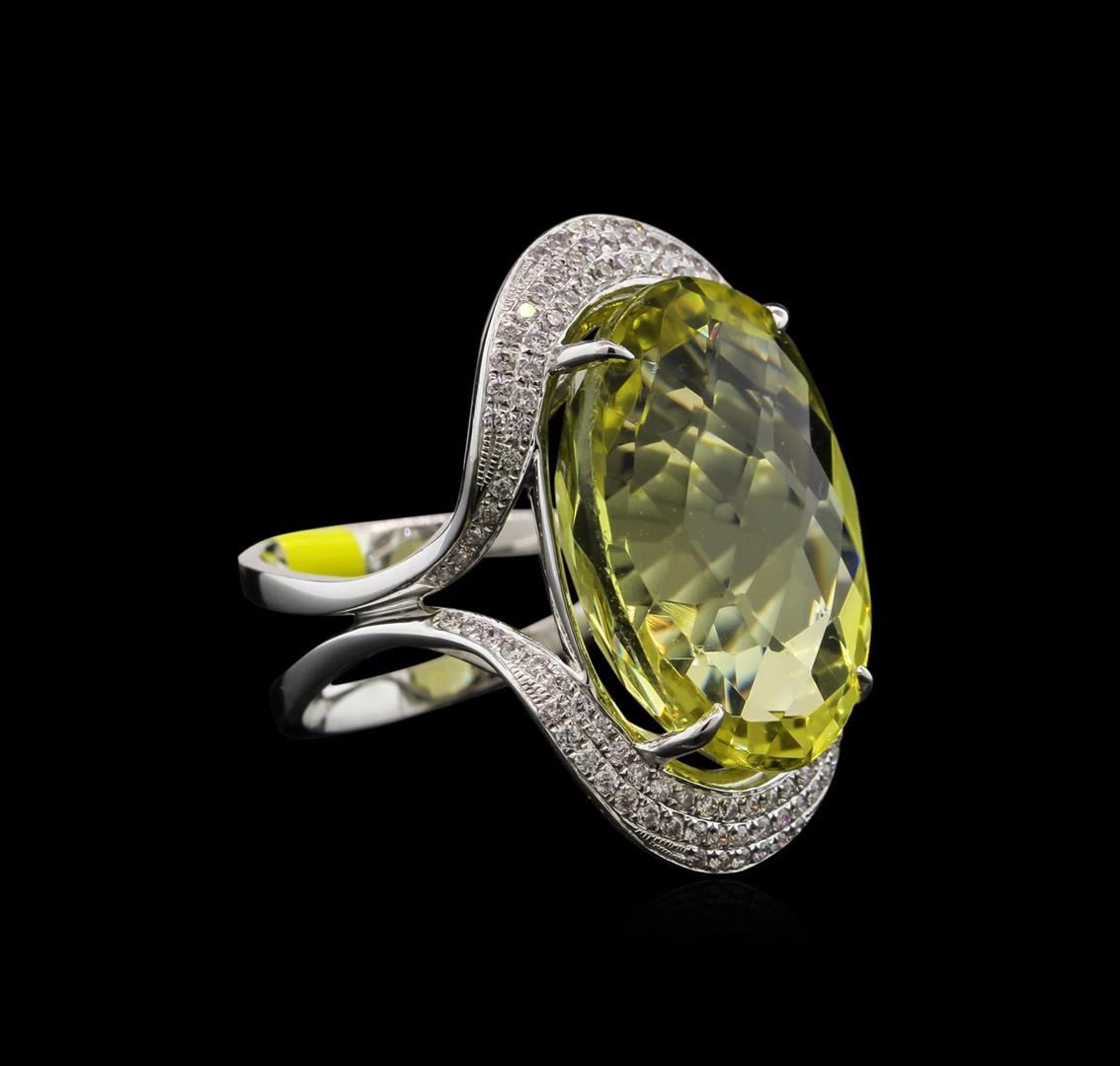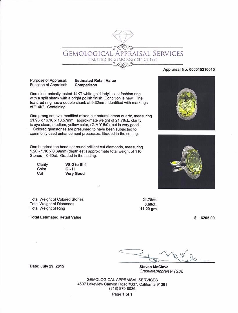 One electronically tested 14KT white gold lady's cast fashion ring with a split shank with a bright polish finish. The featured ring has a double shank at 9.32mm. Identified with markings of "14K". Condition is new. Containing: One prong set oval modified mixed cut natural lemon quartz, measuring 21.95 x 16.10 x 10.57mm, approximate weight of 21.78ct., clarity is eye clean, medium, yellow color, (GIA Y 5/0), cut is very good. Colored gemstones are presumed to have been subjected to commonly used enhancement processes, Graded in the setting. One Hundred Ten bead set round brilliant cut diamonds, measuring 1.20 - 1.10 x 0.69mm (depth est.) approximate. Total Weight of 110 Stones = 0.60ct. Graded in the setting. Clarity: VS-2 to SI-1. Color: G - Very Good. Total Weight of Colored Stones 21.78ct. Total Weight of Diamonds 0.60ct. Total Weight of Ring 11.20gm. GAS Appraised at $6,205.00.