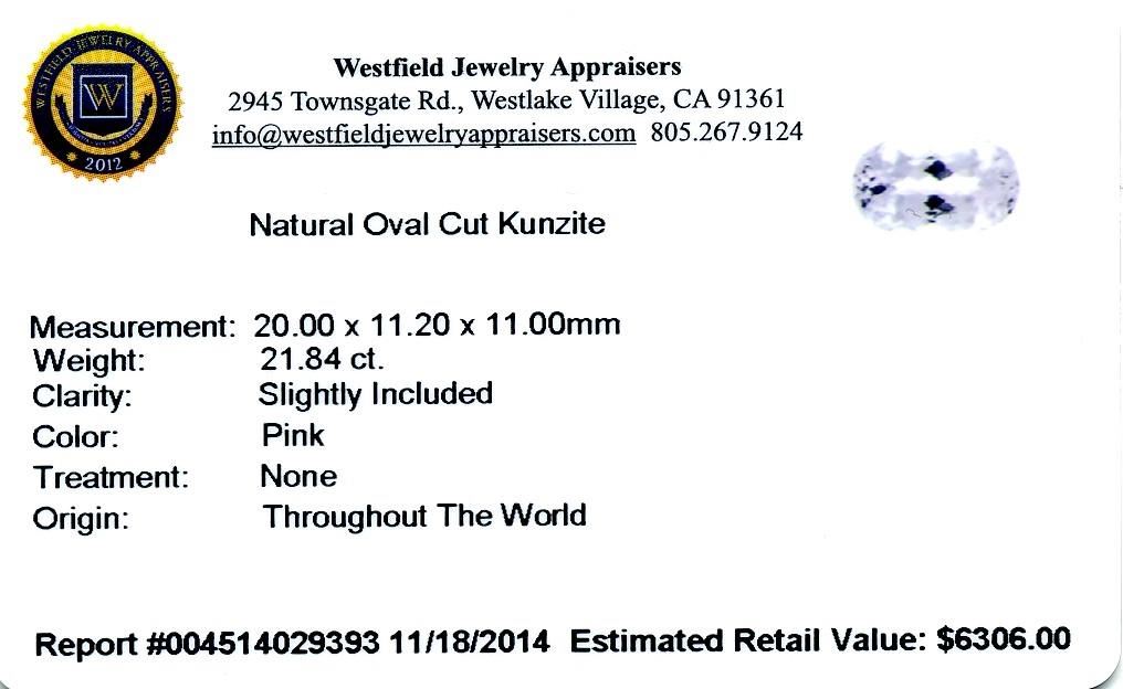 21.84ctw. Natural Oval Cut Kunzite. Westfield Appraised at $6,306.00.