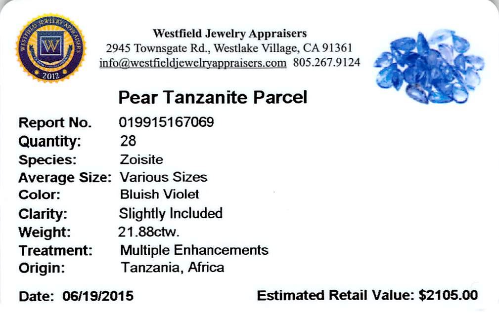 Twenty-eight pear mixed cut natural tanzanites exact total weight 21.88ct., clarity is slightly included, type I, medium dark, very slightly grayish, bluish violet color, (GIA bV 6/3), cut is good. Transmitting light with a minimum of distortion, trans Westfield Appraised at $2,105.00.