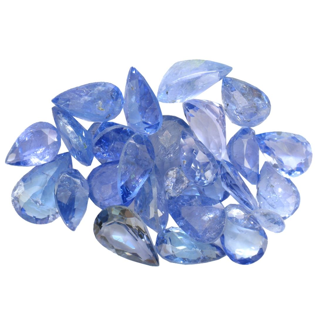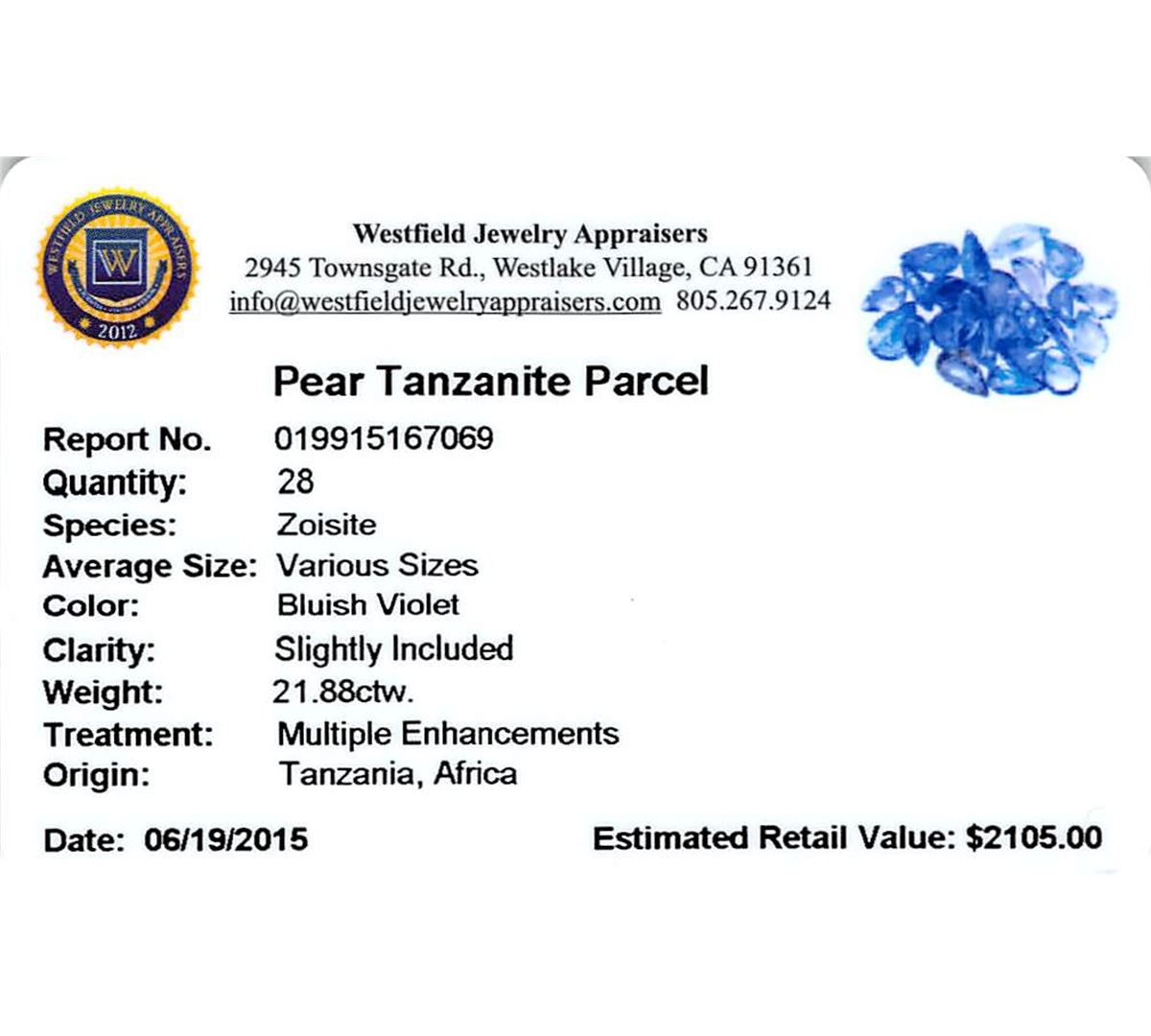 Twenty-eight pear mixed cut natural tanzanites exact total weight 21.88ct., clarity is slightly included, type I, medium dark, very slightly grayish, bluish violet color, (GIA bV 6/3), cut is good. Transmitting light with a minimum of distortion, transparent. Naturally occurring internal & external characteristics are present. Color grade is an average for the group. Tanzanite is a very rare gemstone that is only found in the country of Tanzania. Originally discovered in 1967. Tiffany & Company, named the stone Tanzanite. It is found in the Usumburu Mountains that border the Umba Valley of northern Tanzania. Tanzanite occurs in gray, brown, violet, blue, reddish-purple, & green. The gem is interesting because of its exceptional pleochroism. Rotated in different directions a tanzanite will exhibit multiple changes of color. Tanzanite has a low tolerance to ultrasonic cleaning, and should not be cleaned using this method. Westfield Appraised at $2,105.00.