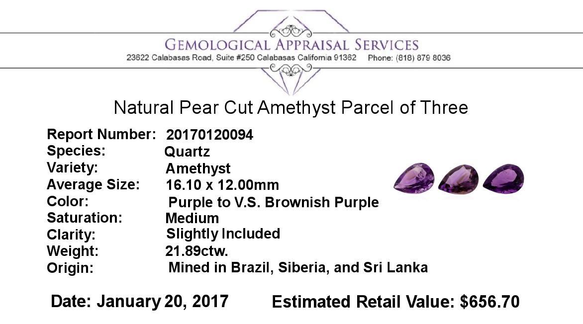 One natural pear cut amethyst parcel of three with an exact weight of 21.89ctw., clarity is slightly included, purple to v.s. brownish purple, medium. Gemological Appraisals Services estimates the retail value at $656.7 GAS Appraised.