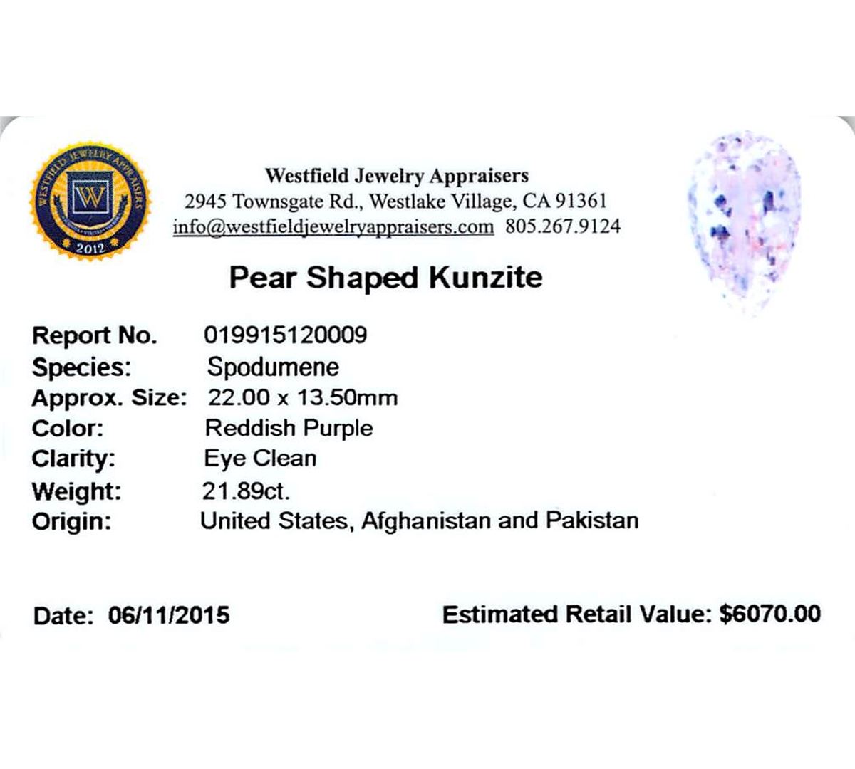 One pear mixed cut natural kunzite, measuring 22.00 x 13.50 x 11.00mm, exact weight 21.89ct., clarity is eye clean, type I, medium light, very slightly grayish, reddish purple color, (GIA rP 4/3), cut is good. Transmitting light with no distortion, transparent. Westfield Appraised at $6,070.00.