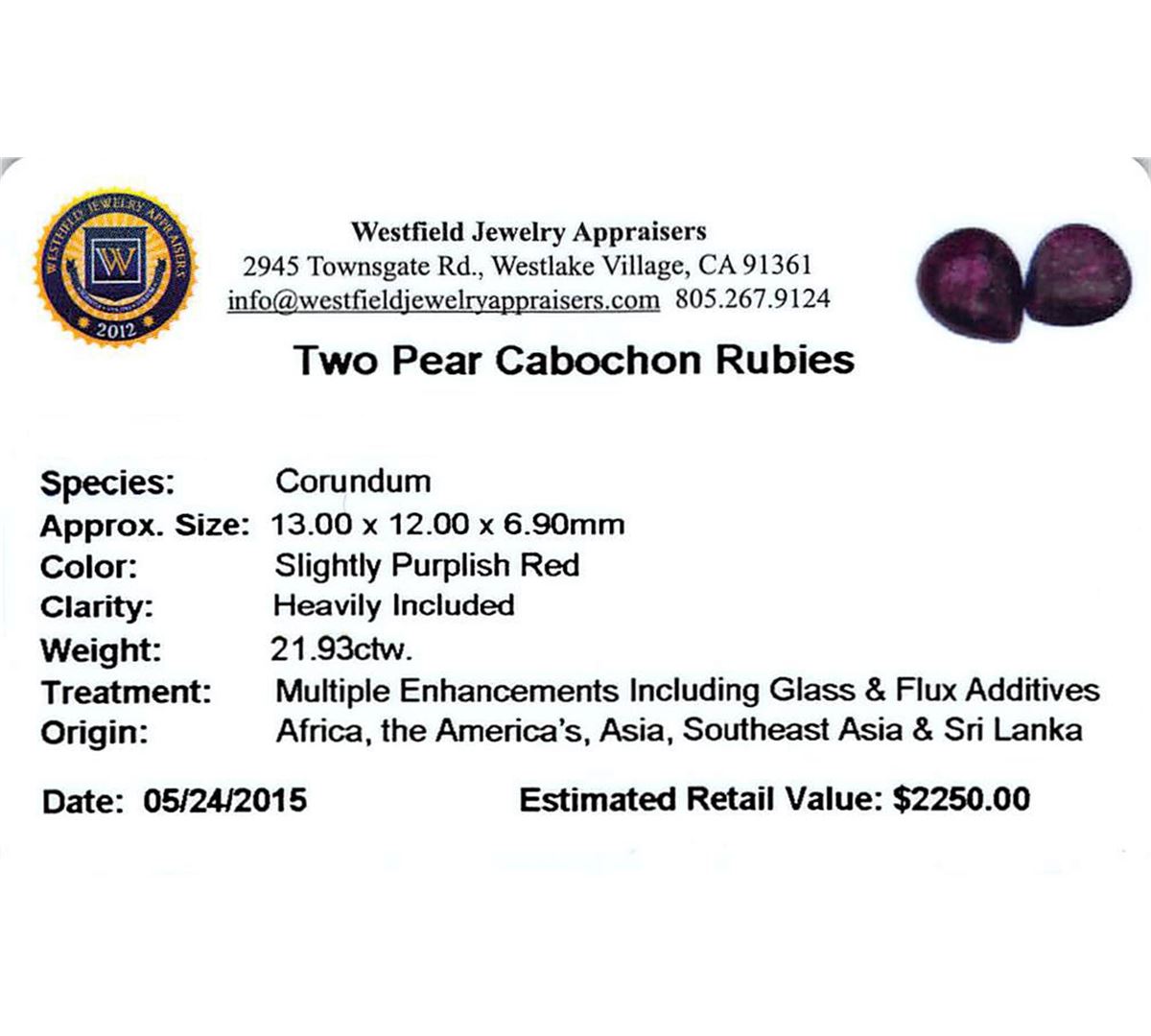 Two pear cabochon cut natural rubies, measuring 13.00 x 12.00 x 6.90mm, exact total weight 21.93ct., clarity is heavily included, type II, dark, very slightly brownish, slightly purplish red color, (GIA slpR 7/3), cut is good. Transmitting light diffusely, opaque. Naturally occurring internal & external characteristics are present. Indications of laboratory high temperature heat treatment, with glass & flux additives. Ruby has a low tolerance to rhodium plating, repolishing the surface, & ultrasonic cleaning. Westfield Appraised at $2,250.00.